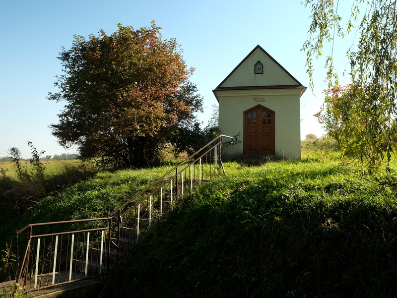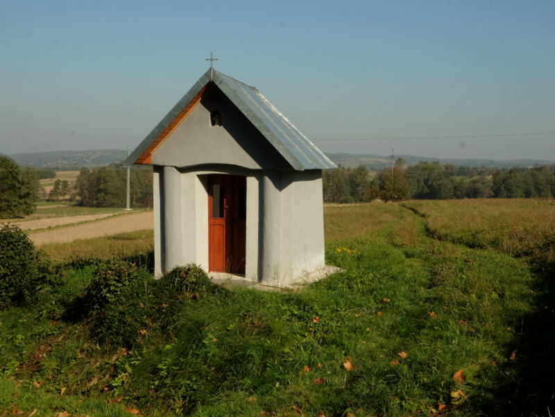 … po czym za skrzyżowaniem wiejskich dróg skręcamy na wschód. Tam, naprzeciw ostatniego domu, już na wschodnim skraju wsi, stoi murowana kapliczka domkowa z 1961 roku.