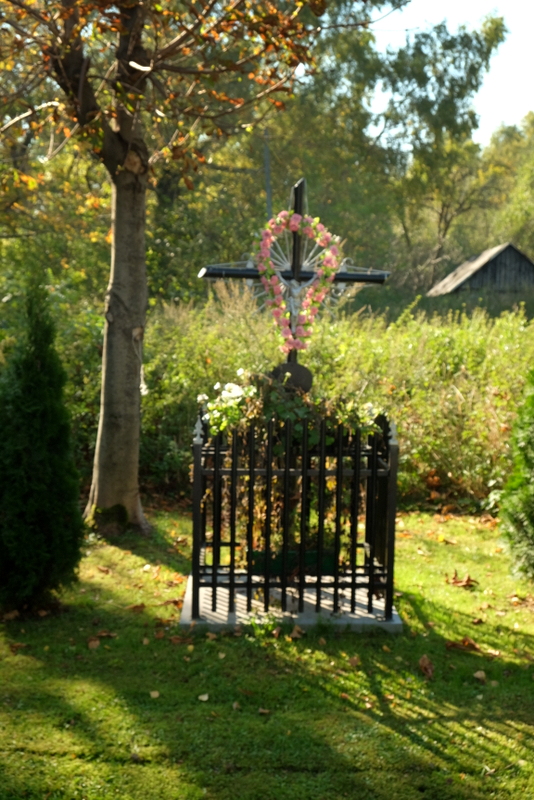 Nieco dalej, z prawej strony drogi stoi ogrodzony metalowym płotem i ozdobiony kwiatami krzyż.