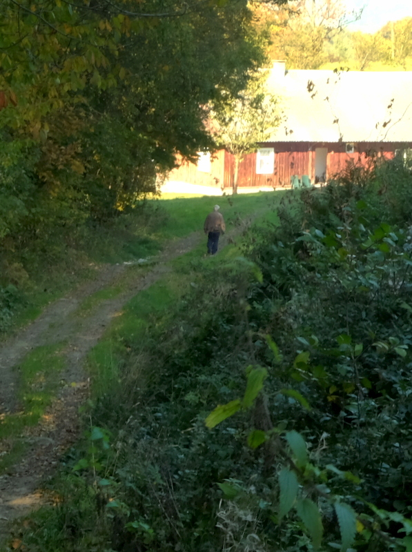 Z przysiółka Góry Trzecie wracamy do grzbietu i tam zmieniamy kierunek marszu na ogólny wschodni. Droga jest urozmaicona – kluczy tutaj a to skrajem lasu, to znów wchodząc w las, po czym przechodząc przez niewielkie polany. Jest tu dużo rozgałęzień i odchodzących w bok dróżek więc trzeba uważać aby się nie pogubić. Najpewniej trzeba trzymać się grzbietu. Pies oczywiście wciąż idzie z nami. Wzdłuż drogi rosną liczne tu krzewy tarniny, na których jest jeszcze dużo dojrzałych owoców. Wyglądają bardzo ładnie i moja towarzyszka wędrówki ma ochotę nazrywać sobie trochę tych owoców. Zatrzymujemy się szukając w plecakach pojemników po kanapkach i zrywamy do nich owoce, z których zrobimy później pyszne nalewki. Zawsze warto łączyć przyjemne z pożytecznym.