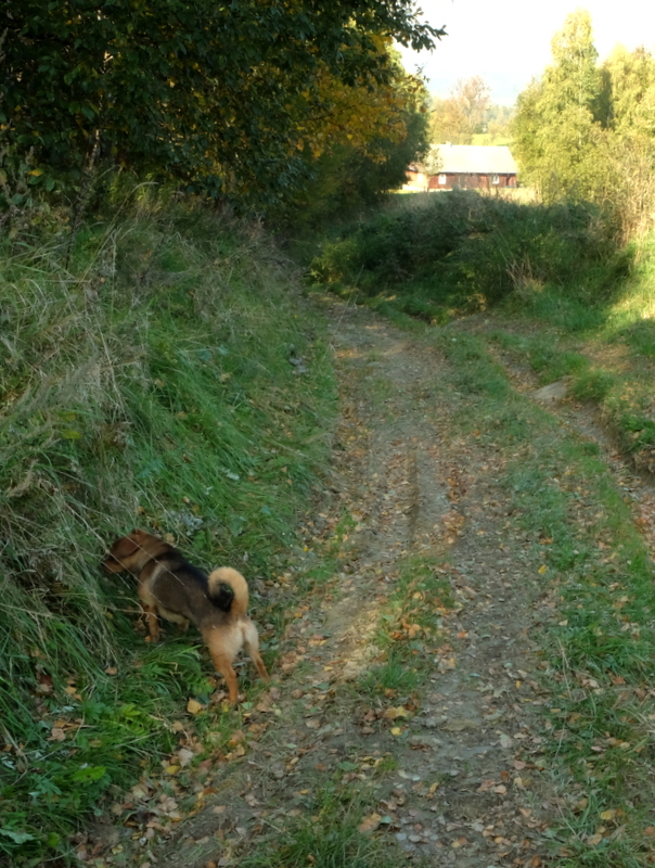 Podczas przechodzenia obok ostatniego domu wypada z niego młody pies obszczekując nas głośno. Nie ustaje w tym szczekaniu a nawet próbuje zaatakować nasze nogi chronione stuptutami. Próbujemy go uspokoić i odgonić ale on nie ustępuje. W końcu wychodzi z domu jego właściciel i reaguje przywołując go do siebie. Pies nie ma ochoty słuchać i wciąż biegnie za nami, cały czas szczekając. Zatrzymuję się próbując mówić do niego spokojnie ale on nie ma ochoty wracać do domu. Gospodarz zrezygnowany wraca do siebie klnąc coś pod nosem a pies szczekając wciąż idzie za nami. Trwa to jeszcze jakiś czas, my jednak idąc dalej staramy się nie zwracać na niego uwagi.