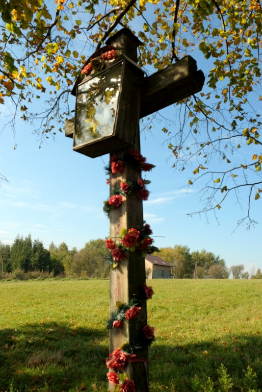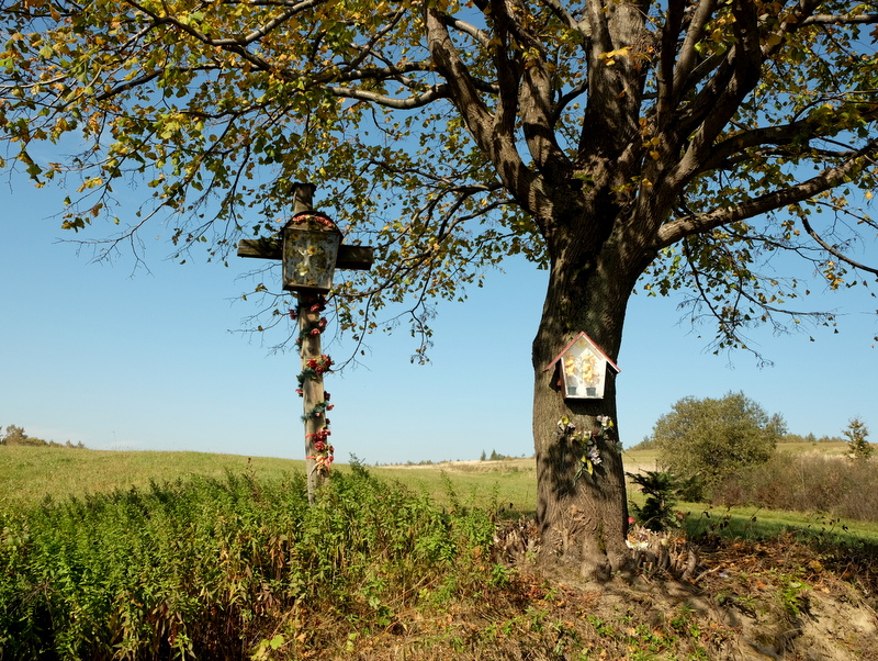 Poniżej kilku domów na stromej skarpie szutrowej drogi, między brzozą i rozłożystą lipą stoi skromny, drewniany krzyż z kapliczką skrzynkową. Ponadto na pniu tej lipy umieszczono inną kapliczkę skrzynkową. Zawsze podczas swoich wędrówek fotografuję stare, przydrożne krzyże i zabytkowe kapliczki. Mam już mnóstwo podobnych fotografii w swoich archiwach.