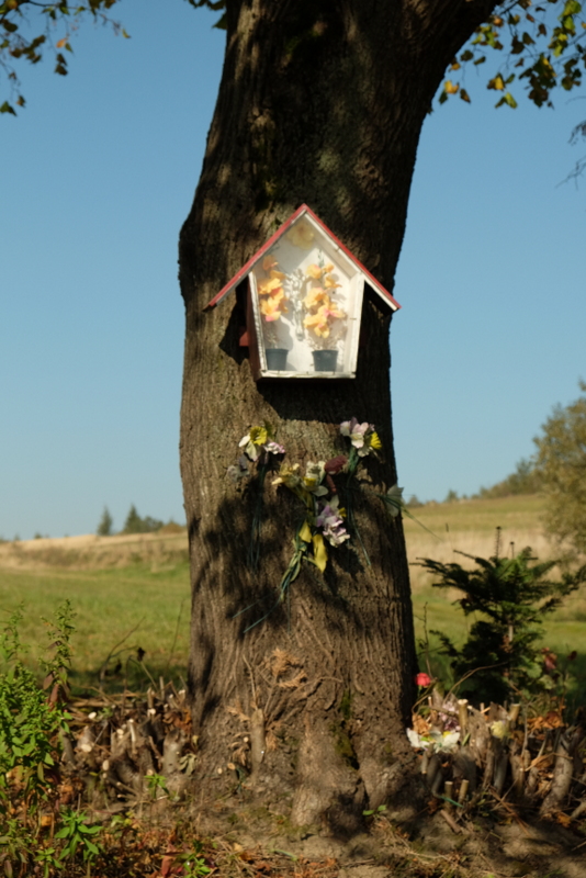 Mijamy kilka zabudowań, kapliczkę domkową oraz skrzynkową zawieszoną na drzewie. Jeszcze kilkanaście lat temu kapliczka ta umieszczona była na potężnej, starej lipie. Rosła ona w sąsiedztwie na niewielkim pagórku. Niestety, została ona jednak ścięta (być może zagrażała już bezpieczeństwu? albo też z innych powodów?). W efekcie kapliczkę przeniesiono na inne drzewo.
