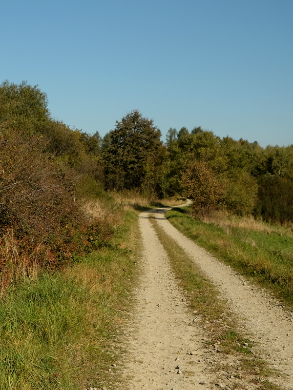Pod szczytem osiągamy szeroką polną drogę, wchodzimy w nią zostawiając szczyt Łysej Góry z lewej strony, po czym osiągamy północnozachodni grzbiet obniżający się w stronę Siedlisk Żmigrodzkich. Grzbietem tym wychodzimy na skraj lasu docierając do miejsca, w którym już byliśmy przed południem.