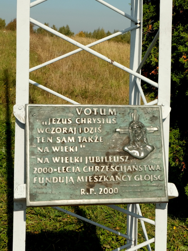 Rok później wyznaczono i wykonano do niego drogę krzyżową. Krzyż i stacje tej drogi oświetlono doprowadzając prąd kablem wkopanym w ziemię. Przy krzyżu ustawiono polowy ołtarzyk i zamontowano tablice wotywną oraz posadzono świerki i tuje. “Napracowano się przy tym solidnie ale warto było” – jak mówią mieszkańcy Głojsc. Ustawiono też ławkę dla strudzonych, na której częściej odpocznie przygodny przechodzień czy wędrowca niż spracowany rolnik, o którego już trudno. Również i my przysiadamy na ławeczce aby cokolwiek się posilić i odpocząć. Korzysta z tego i nasz towarzysz wędrówki bo i jego też trochę podkarmiamy.