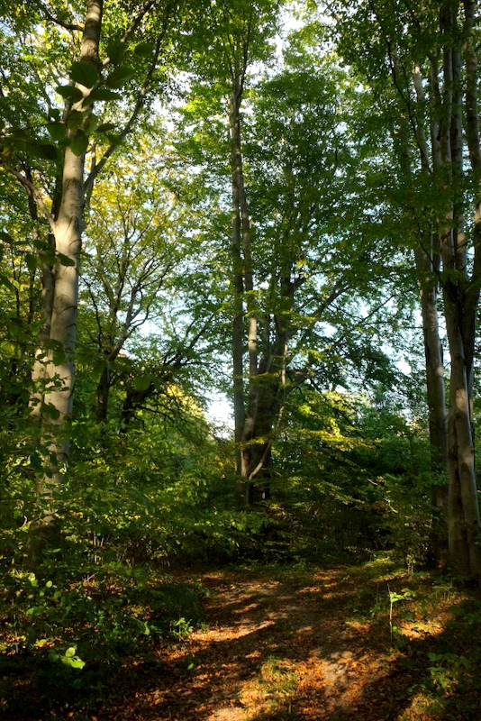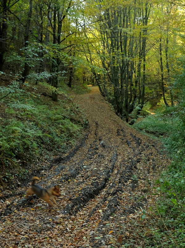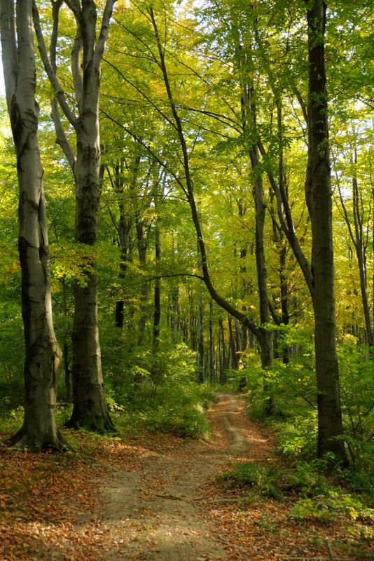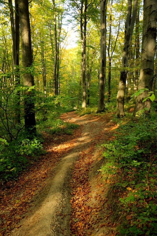 Liście na drzewach zaczynają się już wybarwiać a słońce wszystko ładnie oświetla podkreślając kontrastami kolory jesieni. Trzeba przyznać, że jest tu bardzo pięknie i spokojnie więc naprawdę można się zrelaksować. Droga grzbietem Biedacza wprowadza nas do lasu zwanego Lasem Makowskim. Zajmuje on obszar na północnych stokach Łysej Góry (526 m n.p.m.) i Łosikowej Góry (504 m n.p.m.).