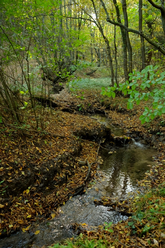 Przechodzimy na drugą stronę potoku gdzie nasza droga nabiera wysokości. Poniżej skarpy widać rozlewisko – to zbiornik, który utworzyły tu bobry. W miejscu gdzie do Omywaczki uchodzi znaczniejszy potok zaczyna się las. Tu też zaczynają się głębokie jary wyżłobione przez wody potoków.