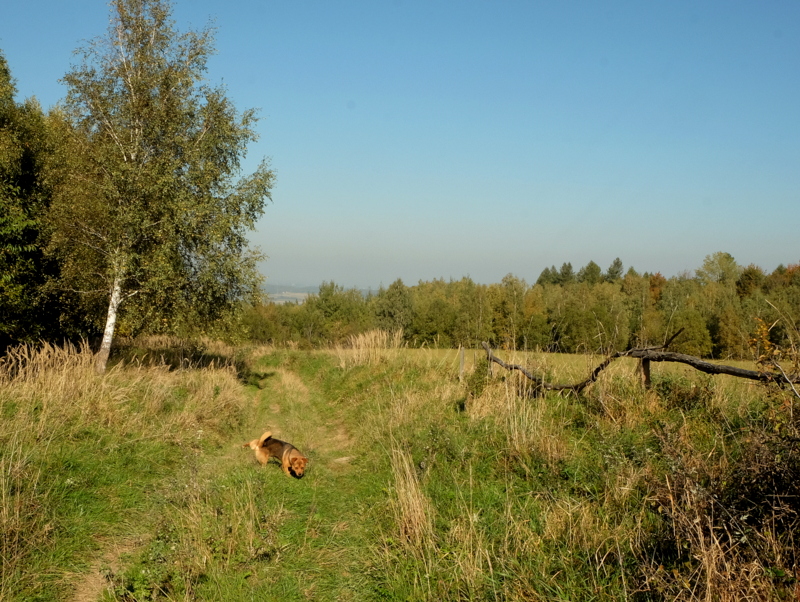 Mijamy niewielki brzozowy zagajnik wchodząc do niego aby zobaczyć, czy są jakieś grzyby dając też czas psu aby sobie poszedł. Skutek tego taki, że żadnych grzybów nie znajdujemy a pies jak był przy nas tak dalej jest i widać, że nie ma zamiaru tego zmieniać.