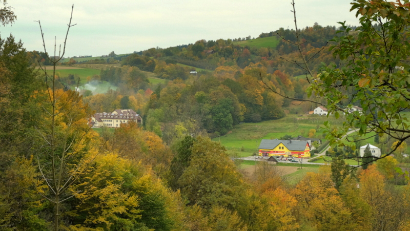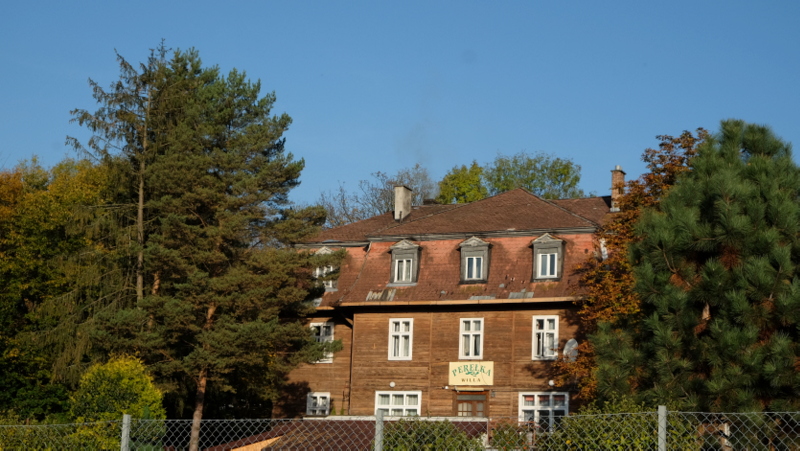 Z centrum Szymbarku kierujemy się na północ za znakami zielonego szlaku PTTK, mijając z lewej strony duży, zadbany piętrowy budynek drewniany. Pamiętam, że dawniej – jeszcze w latach 70-tych XX wieku mieścił się w nim DW Kamionka. Obecnie ten pensjonat nazywa się Willa Perełka.