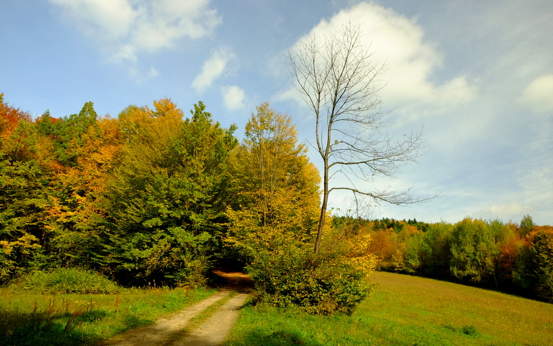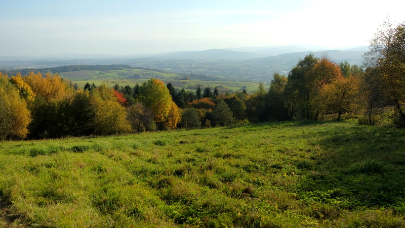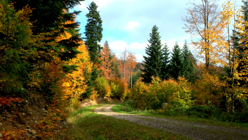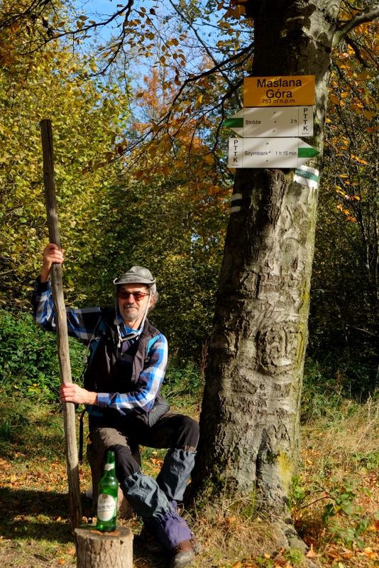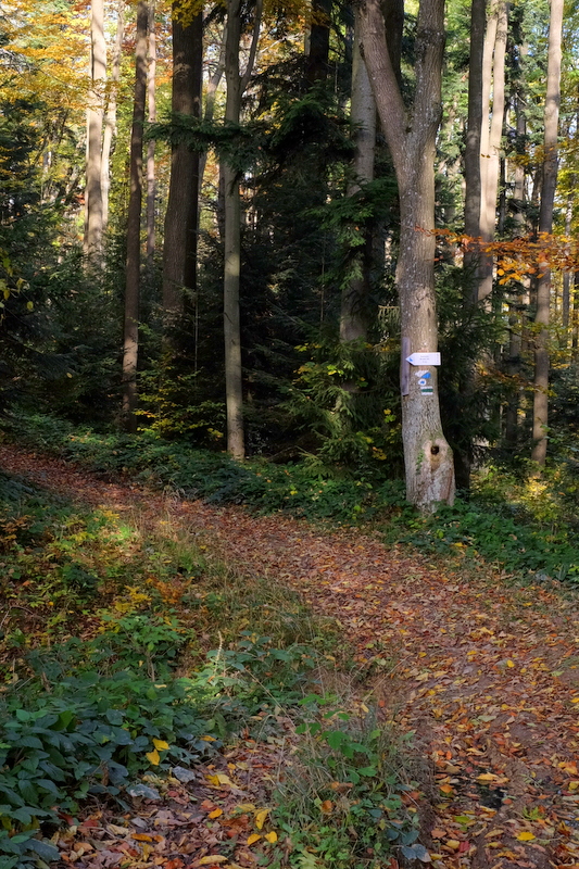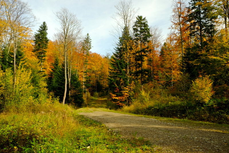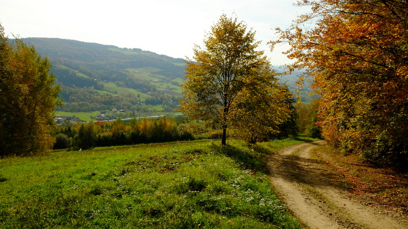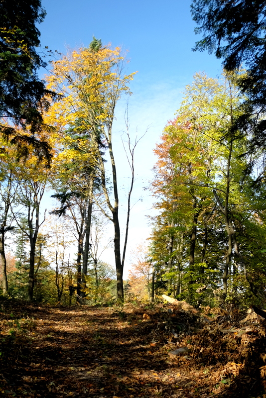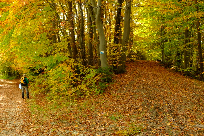 Drogą ze szczytu po przejściu około 500 metrów docieramy do stokówki, którą dalej idziemy na południe. Mieszane lasy południowo-zachodnich stoków Maślanej i Jeleniej Góry dobrze oświetlone przez słońce, mienią się żywymi barwami tej pory roku. Nic tylko cieszyć się z tego zjawiska.