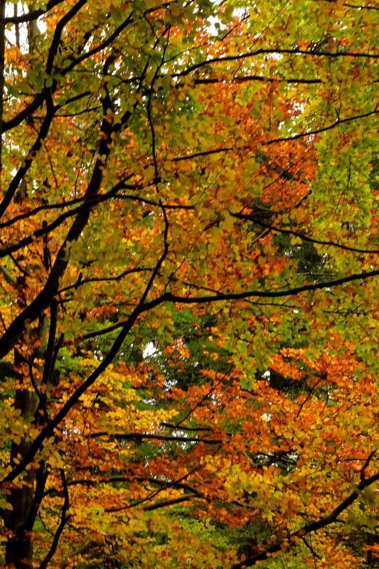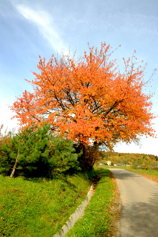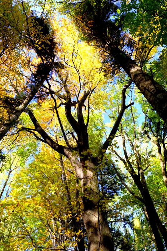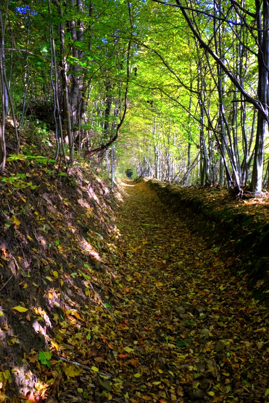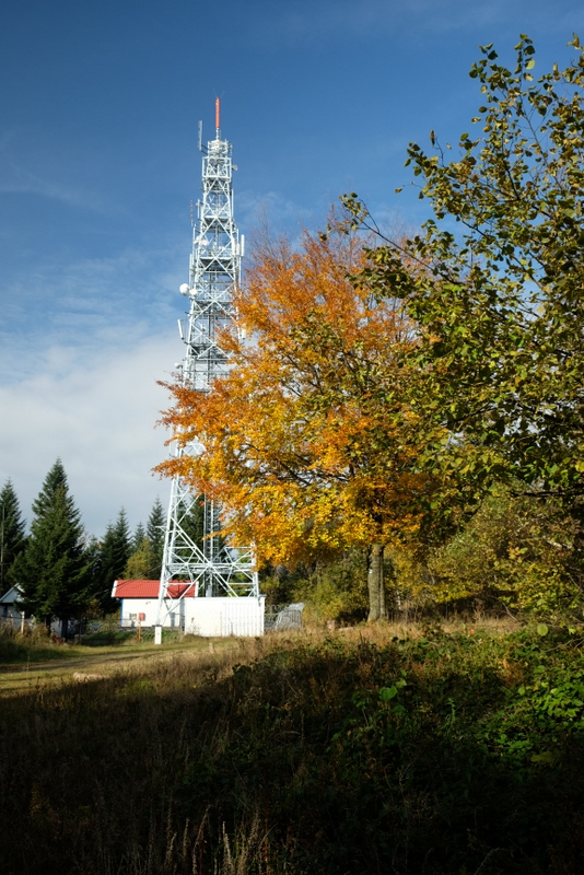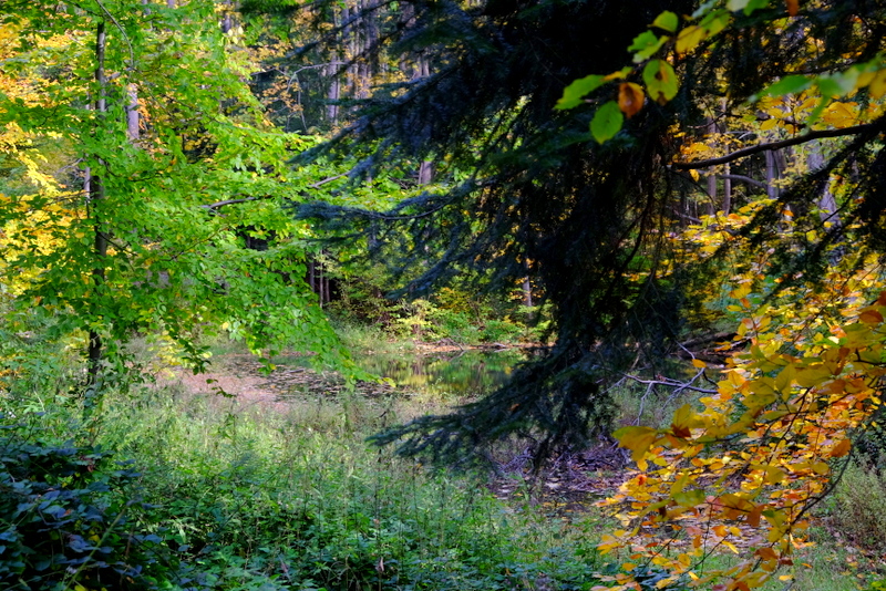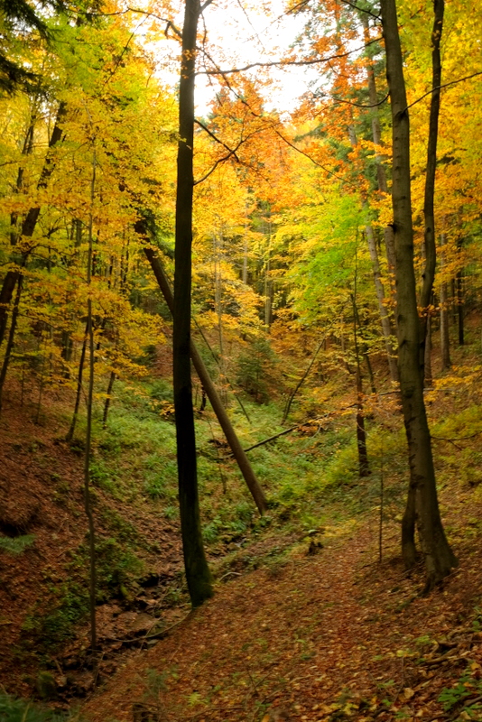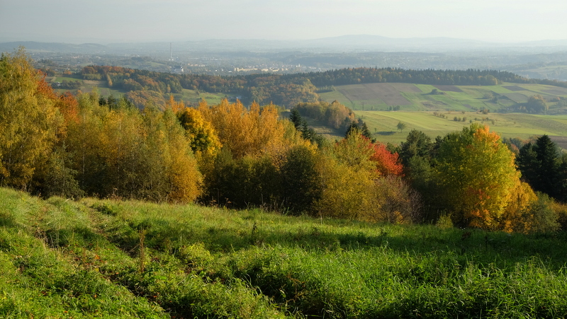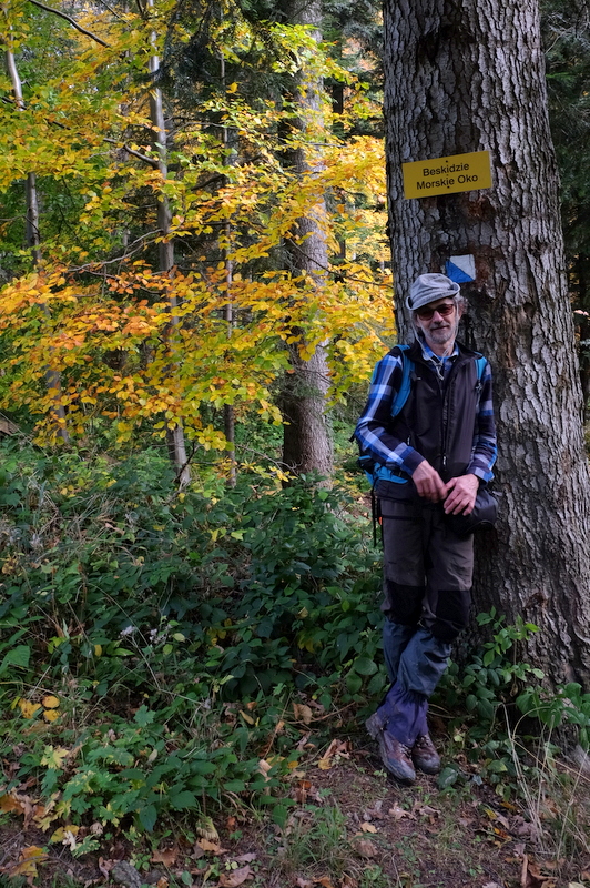 Drogą ze szczytu po przejściu około 500 metrów docieramy do stokówki, którą dalej idziemy na południe. Mieszane lasy południowo-zachodnich stoków Maślanej i Jeleniej Góry dobrze oświetlone przez słońce, mienią się żywymi barwami tej pory roku. Nic tylko cieszyć się z tego zjawiska.