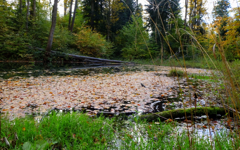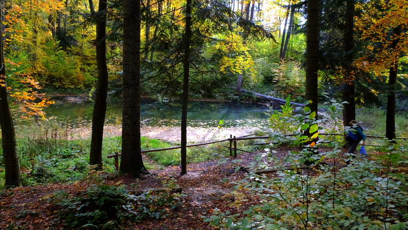 Serią ostrych zakrętów prowadzących teraz w ogólnym kierunku wschodnim wchodzimy w okolice osuwiska. Po chwili spotykamy znaki biało-niebieskiego szlaku i wkrótce osiągamy otoczone drewnianymi palikami niezbyt duże jeziorko.