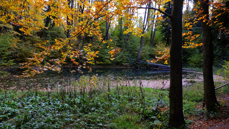Pod koniec pierwszej połowy października – a więc w porze babiego lata i przepięknych kolorów jesieni – wybraliśmy się z koleżanką w okolice Szymbarku. Pierwszym z celów naszej wędrówki było wejście na szczyt Maślanej Góry. Następnym największe osuwisko w Karpatach polskich zwane Osuwiskiem Szklarki i znajdujące się w tym rejonie urokliwe jeziorko osuwiskowe. „Beskidzkie Morskie Oko” – bo tak nazwane zostało to jeziorko – powstało w wyniku kilkukrotnego osunięcia się gruntu po długotrwałych i obfitych opadach deszczu. Ogromne masy ziemi porośniętej lasem i materiału skalnego zsunęło się z zachodnich stoków Jeleniej Góry oraz południowych stoków Maślanej Góry niszcząc wszystko po drodze i tamując odpływ wody potoków.