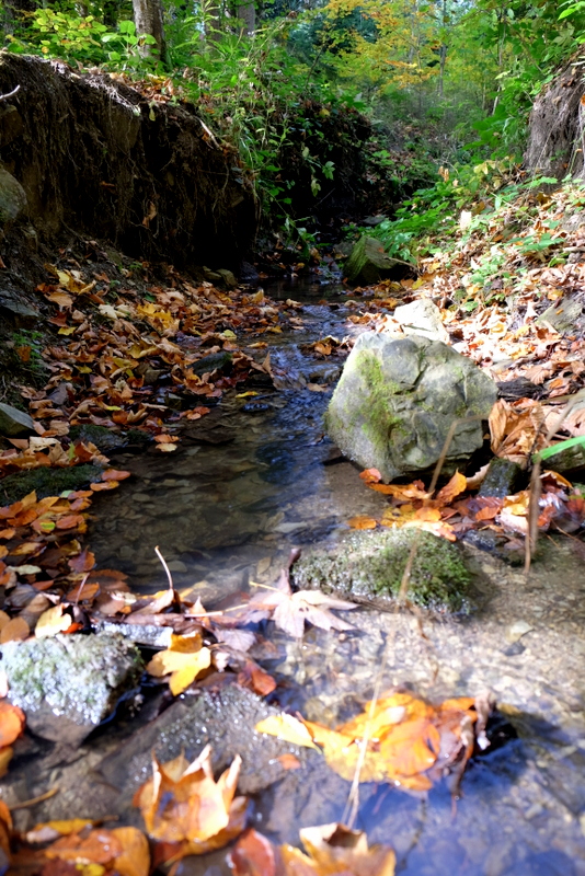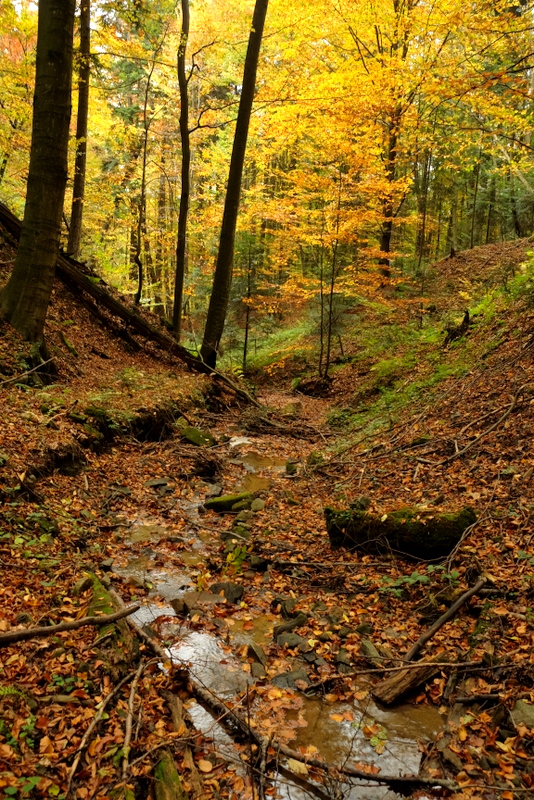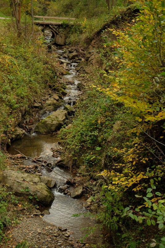 Niedaleko od domu zaczyna się ściana lasu więc wchodzimy w ten las. Droga też się kończy bo mało kto tutaj się zapuszcza a teren zaczyna się obniżać w głęboki jar potoku, w uroczysku u północnych stóp Palenicy. Trzeba więc znaleźć dogodne miejsce aby go sforsować. Znajdujemy takie miejsce i przechodzimy na jego drugi brzeg. Około stu metrów dalej następna niespodzianka, którą jest kolejny, tym razem nieco mniejszy strumień.