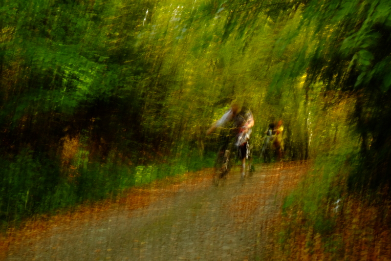 W pewnym momencie minęliśmy się z dwoma rowerzystami prowadzącymi swoje rowery pod stromo wznoszącą się w tym miejscu drogę. Robiąc zdjęcia przez nieuwagę poruszyłem aparatem i jak się później okazało zdjęcia wyszły mocno nieostre i poruszone. Wyszła z tego bardzo ciekawa impresja więc postanowiłem jedno z nich tutaj zamieścić.