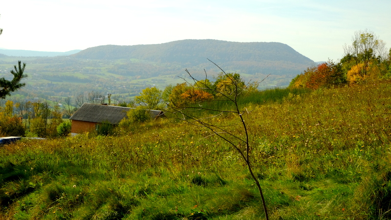Z drogi przez przysiółek Kaweczkówka otworzył się nam widok na charakterystyczny masyw Chełmu.