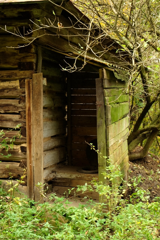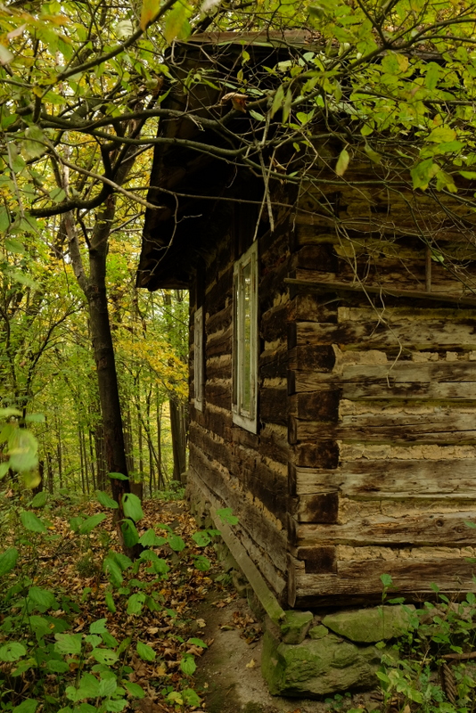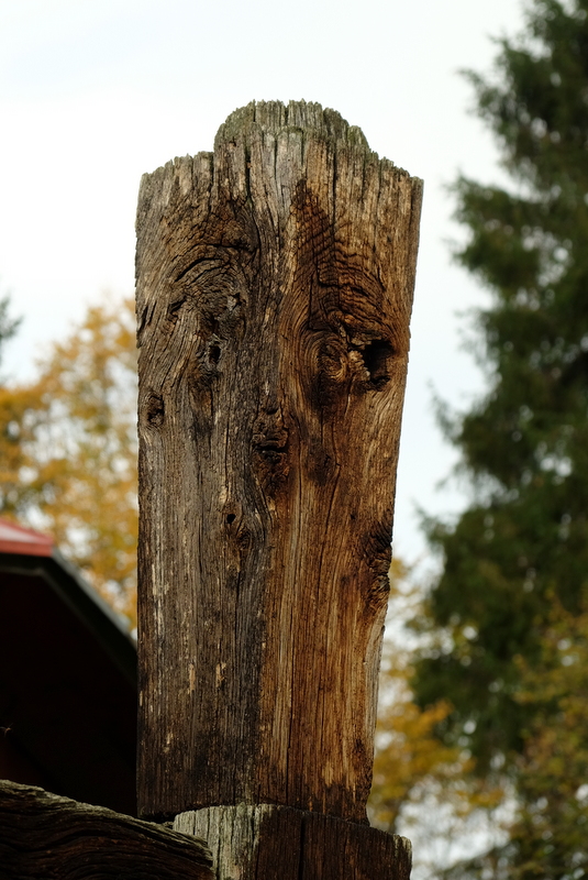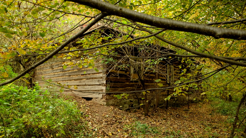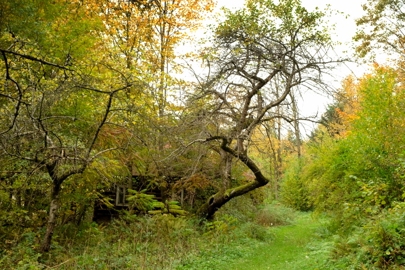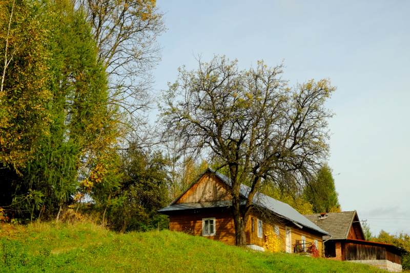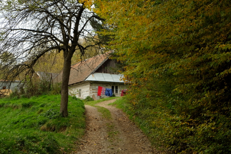 Dalsza droga widać, że od wielu lat bardzo rzadko używana, powoli zarasta krzakami i trawą. W pewnym momencie rzuca się w oczy dziwnie ukształtowane drzewo oraz bielejące okiennice w ciemnej ścianie zasłoniętej gęstwiną krzaków i drzew owocowych. Z bliższej odległości widać też zarys dachu drewnianego domu. Lubię takie stare, opuszczone dawno temu domy więc musimy się tutaj zatrzymać aby dokładniej mu się przyjrzeć.