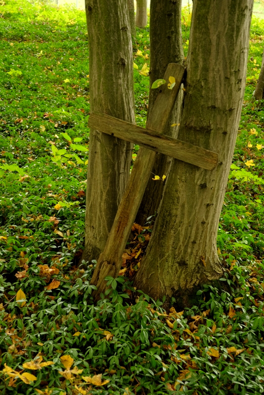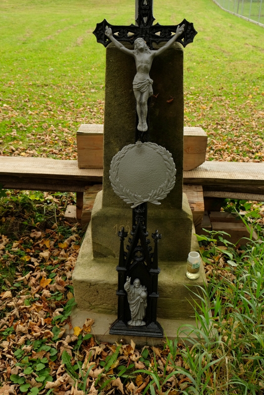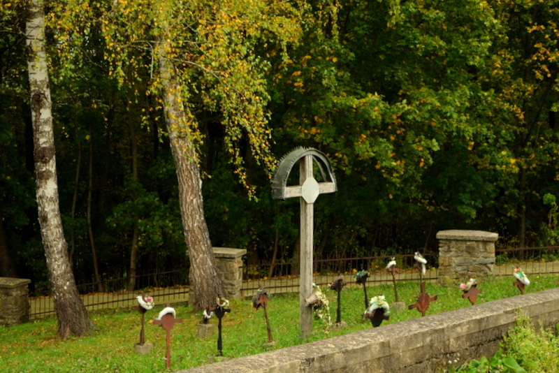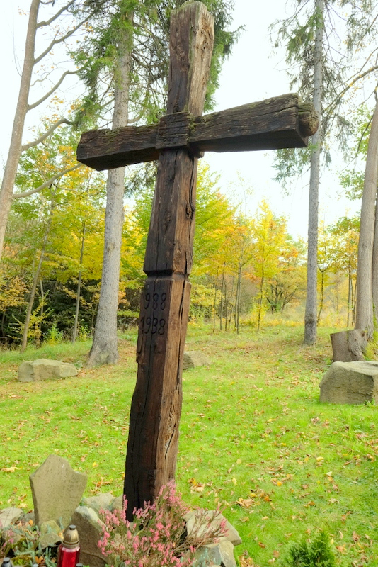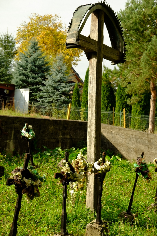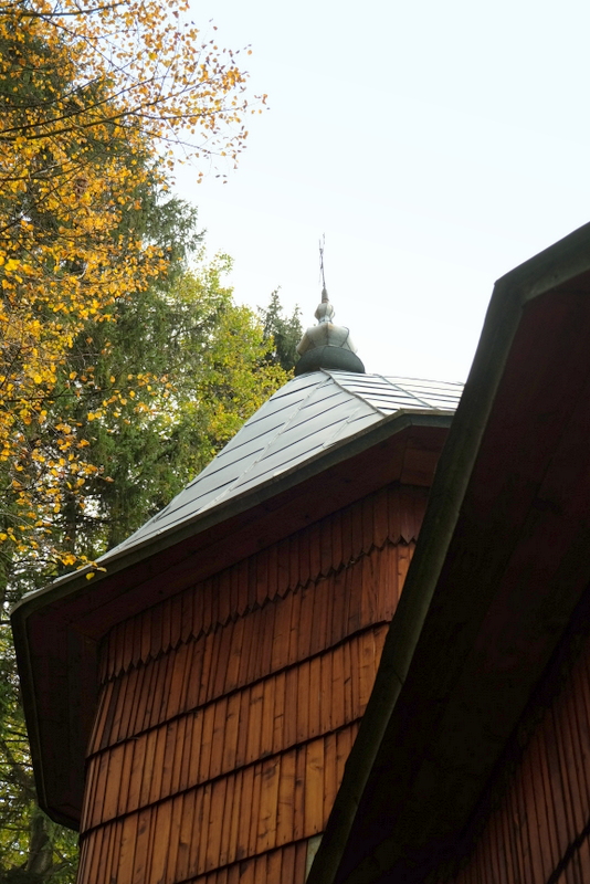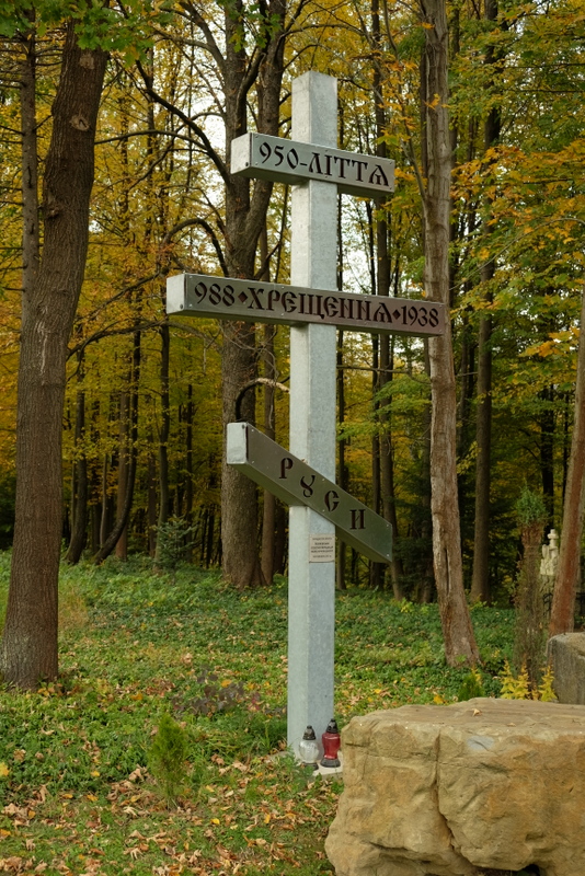 Obok cerkwi stoi stary, drewniany krzyż z wyrytymi datami 988 – 1938 i napisem w tłumaczeniu: „950-lecie Chrztu Rusi”. Warto przyjrzeć się zerodowanej górnej części tego krzyża – układ słojów i wysuszone sęki jako żywo przypominają twarz albo też mordkę jakiegoś zwierzaka.