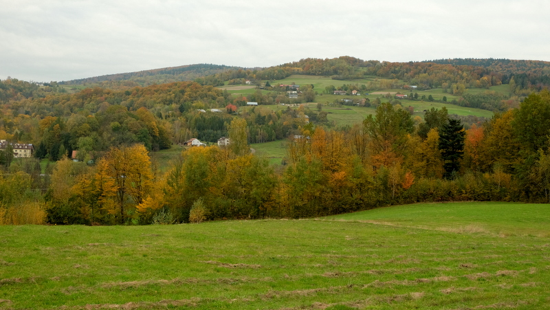 Niewiele tu zabudowań i droga, którą idziemy jest kiepskiej jakości. Nie idziemy jednak nią zbyt długo, bo już po około 400 metrach i dość łagodnym podejściu, osiągamy rozdroże, gdzie skręcamy na wschód. Idąc skrajem lasu ze stoku wzniesienia otwiera się ciekawy widok na leżące u stóp masywu Maślanej Góry Łęgi za Górą.