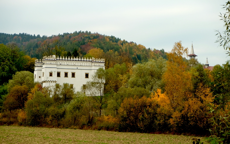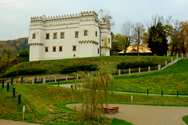 Skręcając przed mostem w prawo kierujemy się w stronę centrum Szymbarku. Wkrótce dochodzimy do malowniczo położonego zamku (kasztelu) na stromym brzegu, nad zakolem Ropy.