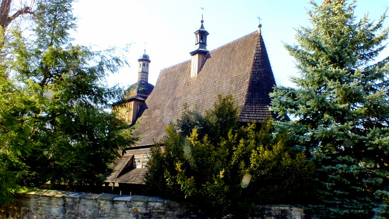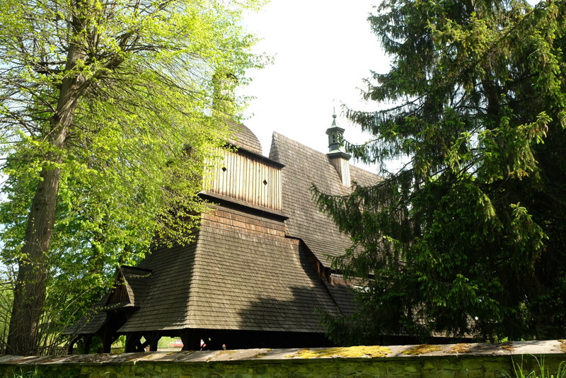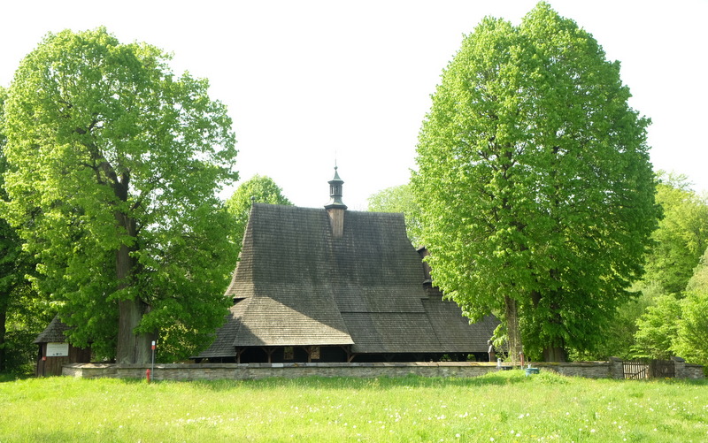 To świątynia p.w. ś.ś. Filipa i Jakuba zbudowana z drewna modrzewiowego na początku lat 20-tych XVI wieku. Podczas I wojny światowej kościół uległ poważnym zniszczeniom i dewastacji – austriackie wojska urządziły w nim stajnię a drewno pozyskiwane z częściowej rozbiórki wykorzystano do budowy umocnień. Tuż po wojnie zaczęto remontować będący w tragicznym stanie kościół tak, że w już 1930 roku został wpisany na listę zabytków. W czasie II wojny kościół ponownie zdewastowano.