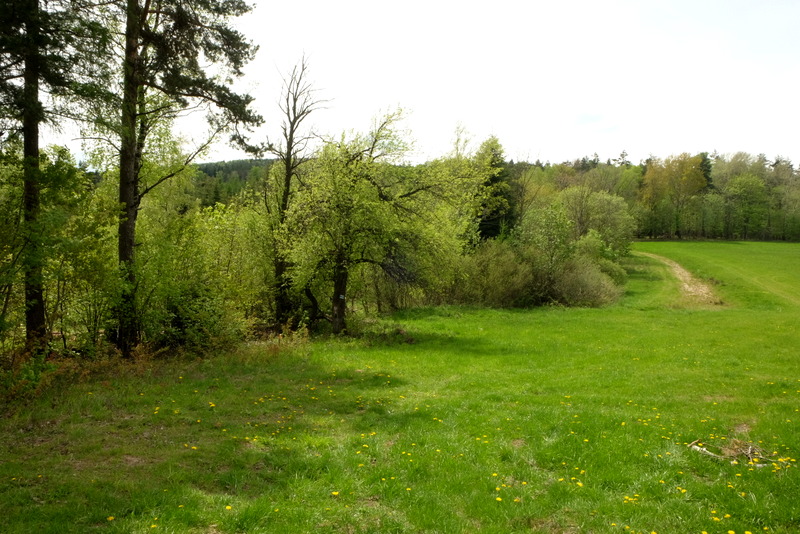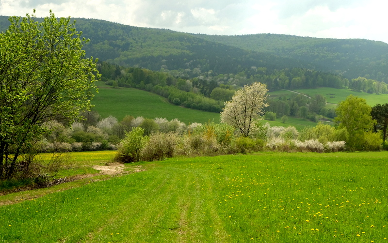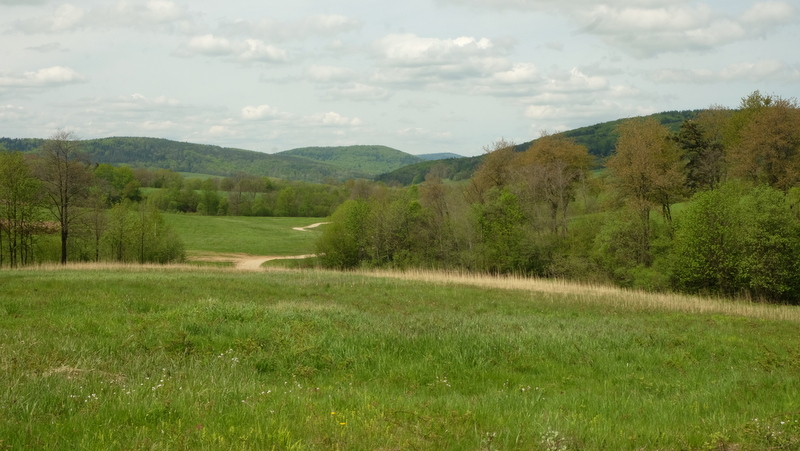 W dalszym ciągu drogi towarzyszą mi piękne widoki ale tylko na lewą, wschodnią stronę, ponieważ prawa, zachodnia porośnieta jest gęstym lasem. Idąc tak i podziwiając widoki niepostrzeżenie docieram do niewlkiego przysiółka zwanego Puste Pole.