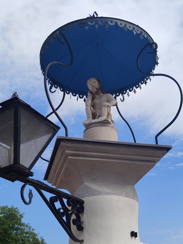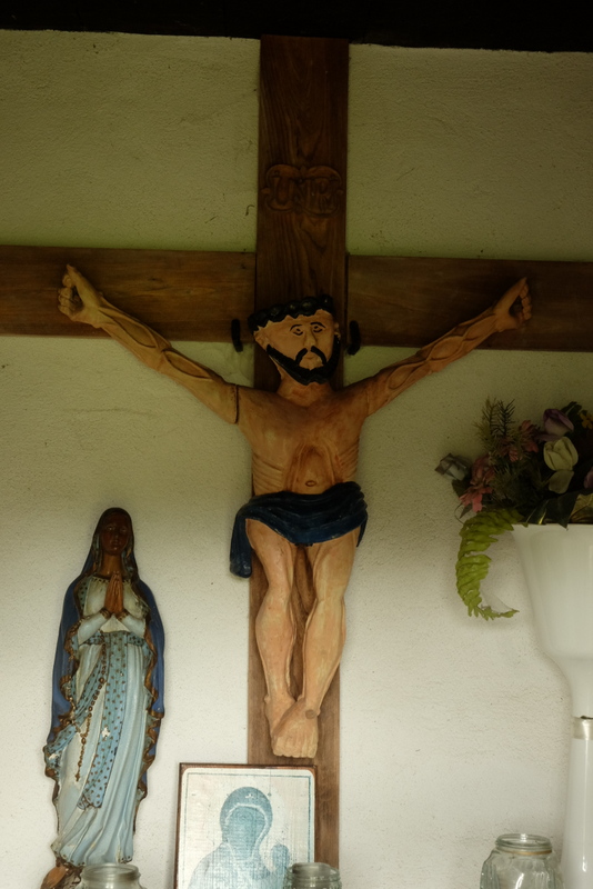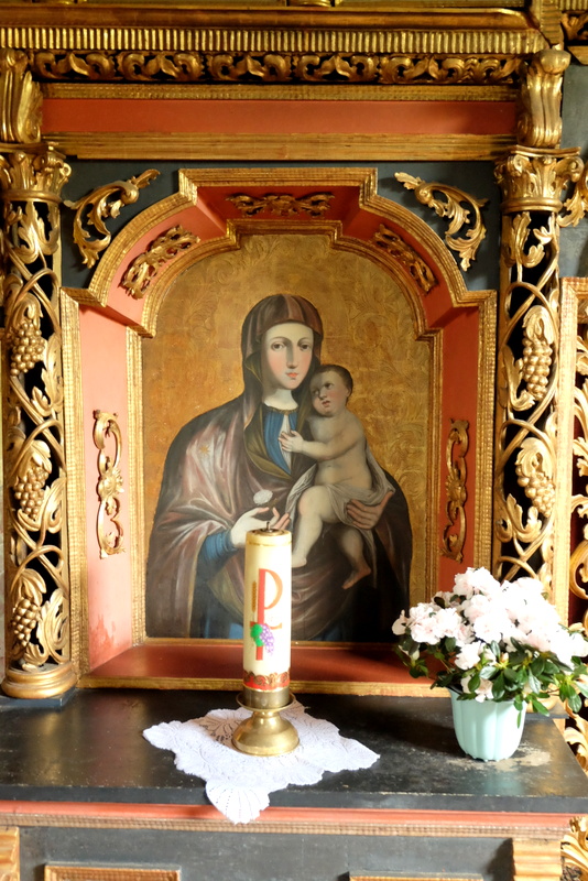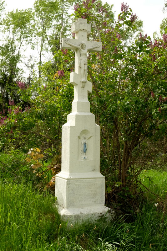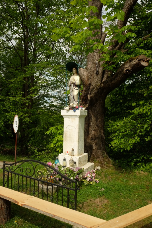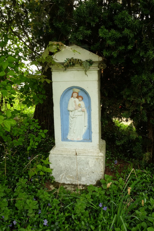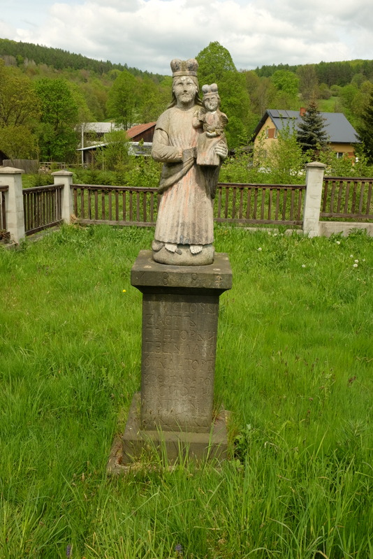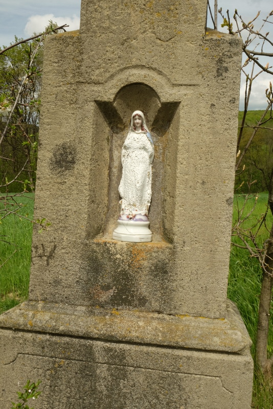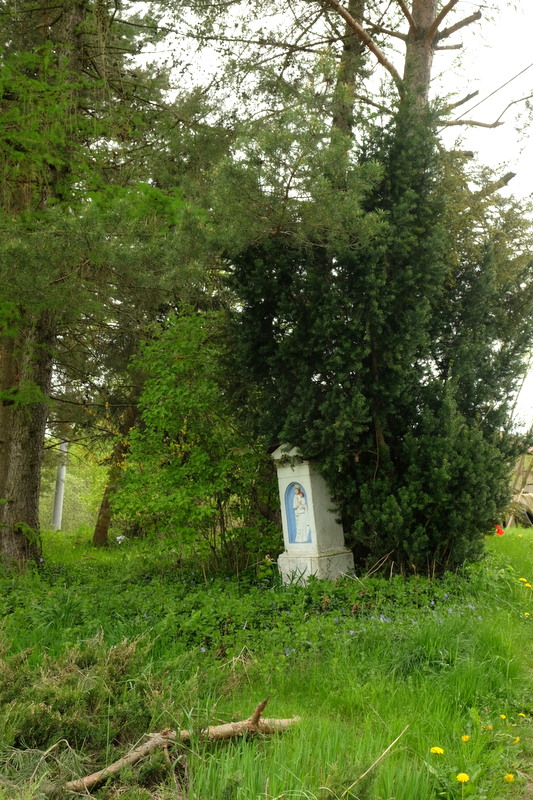 Dalej, po lewej stronie drogi, gdzie zaczynają się pierwsze domostwa, na niewielkiej skarpie można wypatrzeć ukryty w krzakach biały cokół ale bez krzyża. W pomalowanej na niebiesko wnęce bieleje płaskorzeźba Matki Boskiej z Dzieciątkiem. Niestety upływ czasu, erozja czy też wielokrotne malowanie wapnem cokołu uniemożliwia odczytanie daty czy inskrypcji.