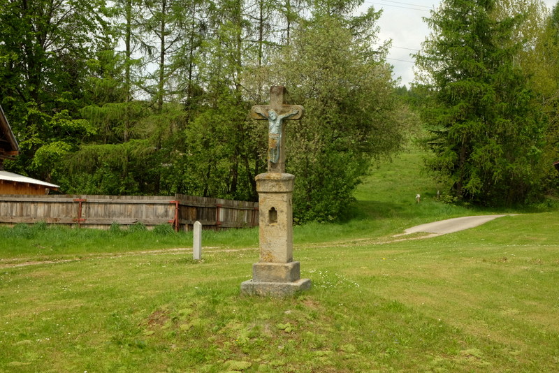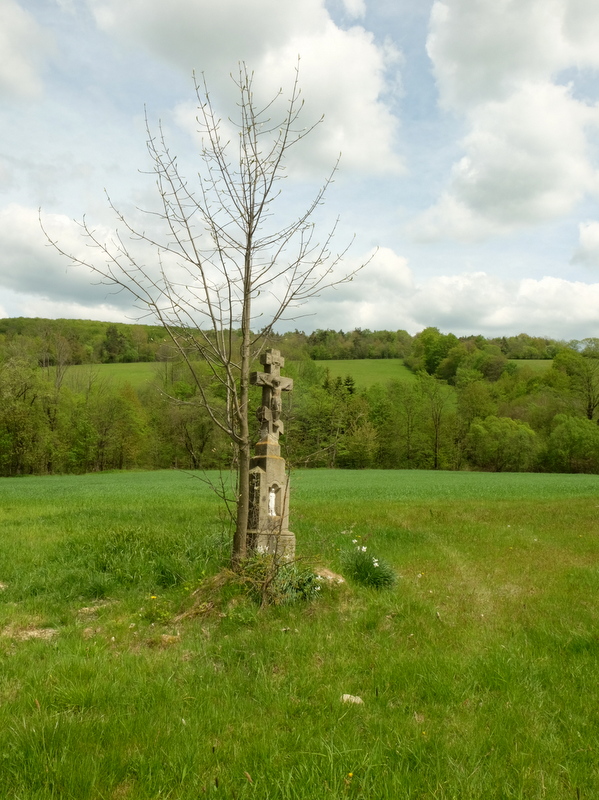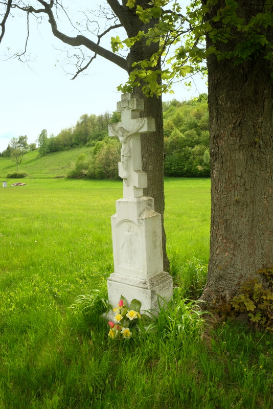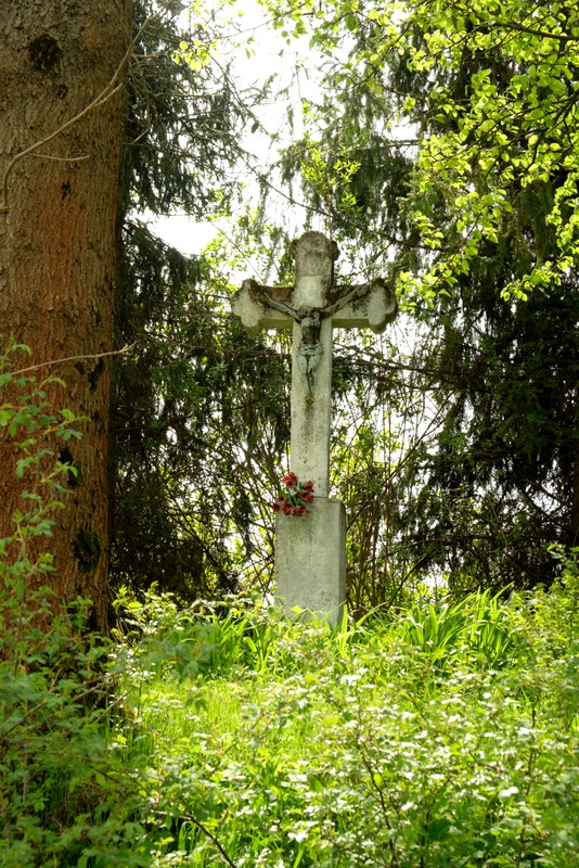 Po prawej stary kamienny krzyż na prywatnym terenie.