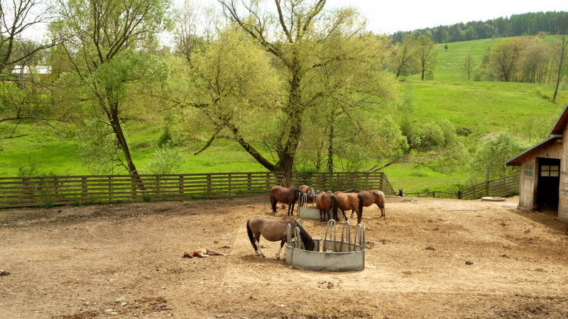 Z lewej strony drogi widoczne gospodarstwo, w którym hodowane są konie.