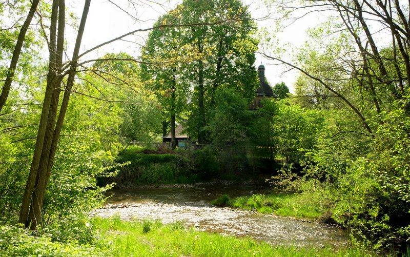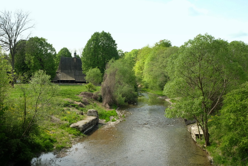 W Sękowej, poniżej mostu nad Sękówką skąd zamierzam wyjść na szlak znajduje się parking, na którym zazwyczaj zatrzymują się turyści pragnący obejrzeć zabytkowy, drewniany kościół gotycki. Zostawiam więc tutaj, na tym rozległym parkingu swój samochód, ruszając w drogę. Mam nadzieję, że gdy będę kończył wędrówkę późnym popołudniem czy wieczorem kościół będzie otwarty, tak abym mógł go obejrzeć od wewnątrz.