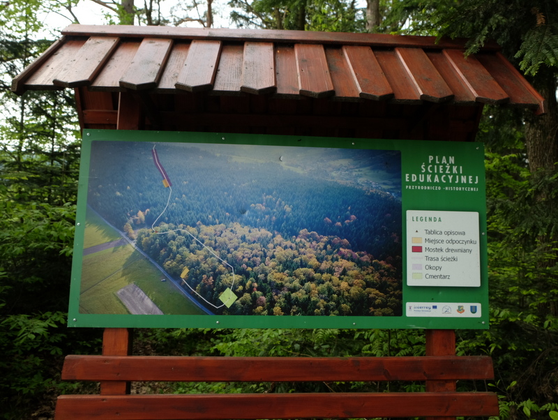 Nieopodal przekaźnika telefonii komórkowej dochodzę do niewielkiego parkingu, przy którym stoi tablica informująca o ścieżce edukacyjnej, która przebiega w tej okolicy. Zagłębiając się w las można na niej zobaczyć odbudowane studnie ropne. Ponadto okopu z czasów I wojny światowej i cmentarz choleryczny. Trwają ponoć prace przy odtworzeniu pierwszej na świecie kopalni ropy naftowej i innych podobnych obiektów.