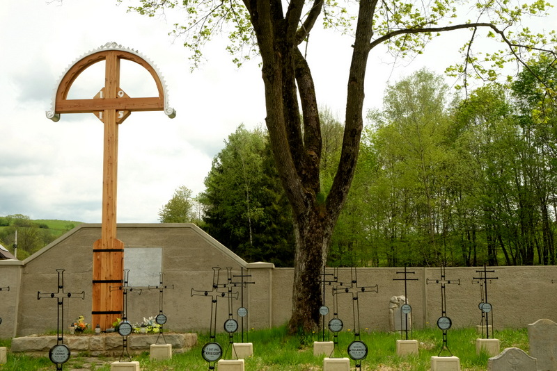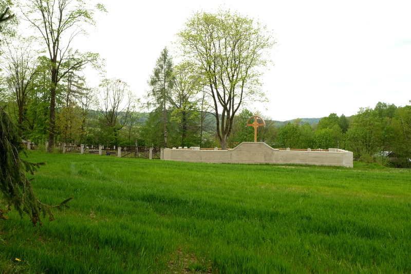 Po prawej już z daleka rzuca się w oczy świeżo wyremontowany mur cmentarza wojennego z wysokim, drewnianym krzyżem. Tuż obok niego znajduje się stary cmentarz łemkowski dawnej wsi Rychwałd Górny.