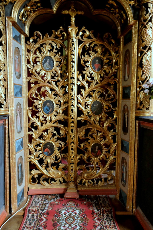 Na uwagę zasłygują też carskie wrota zachwycające ażurową strukturą i przepięknymi, złoconymi zdobieniami.