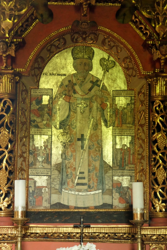 We wnętrzu znajdują się również boczne ołtarze. W południowej ścianie nawy umiejscowiony jest ołtarz św. Mikołaja. Również po przeciwnej stronie znajduje się przyciągający wzrok, barokowy ołtarz Matki Bożej z Dzieciątkiem. Obydwa te ołtarze pochodzą z XVIII wieku. Trzeci, niewielki ołtarzyk z ikoną Chrystusa Nauczającego znajduje się w prezbiterium. Ikona w tym ołtarzyku pochodzi z 1664 i pierwotnie znajdowała się w starszym ikonostasie tej świątyni.