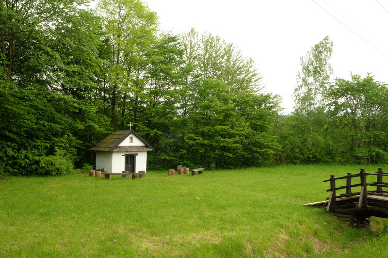 Mijam zadbane domostwa aby w końcu dotrzeć do położonej na skraju wysokiego brzegu potoku, białej kapliczki domkowej krytej gontem. W środku kapliczki, na małym ołtarzyku ładny, drewniany krzyż z z figurką ukrzyżowanego Chrystusa, wykonany przez ludowego artystę.