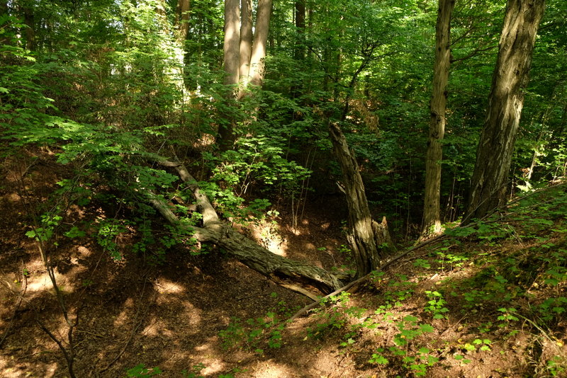 Po minięciu zabudowań, już drogą gruntową, którą poprowadzony jest dalej szlak, wkraczam do lasu. Na pierwszej, dość rozległej polanie, z lewej strony drogi znajduje się duża pasieka. W tym miejscu zaczyna się strome podejście na nieodległy stąd Obocz (nazywany także dawniej Rychwałdzką Górą).