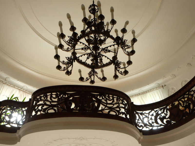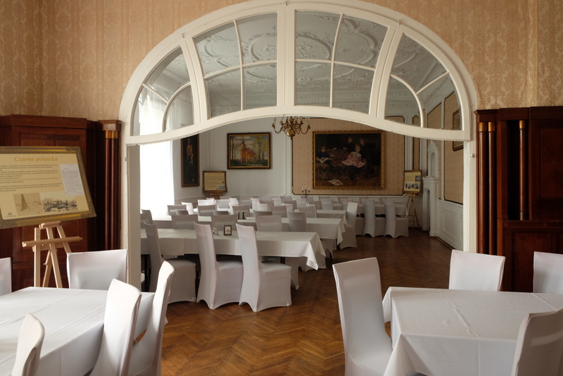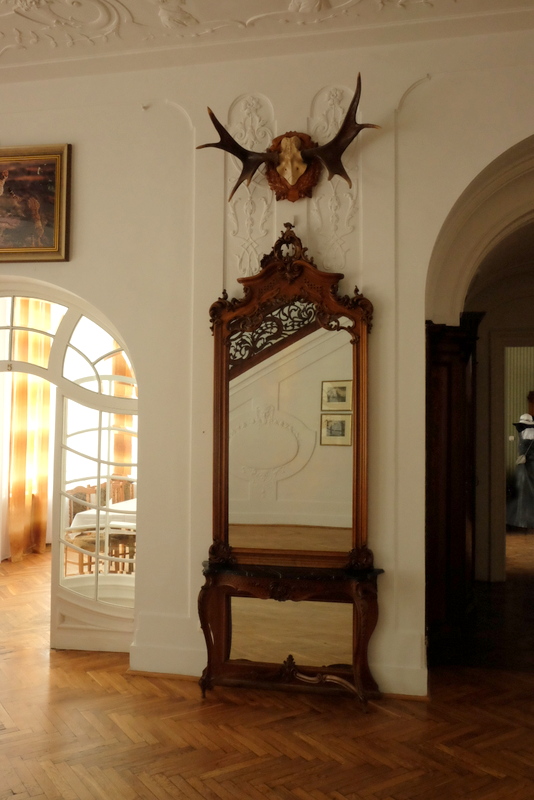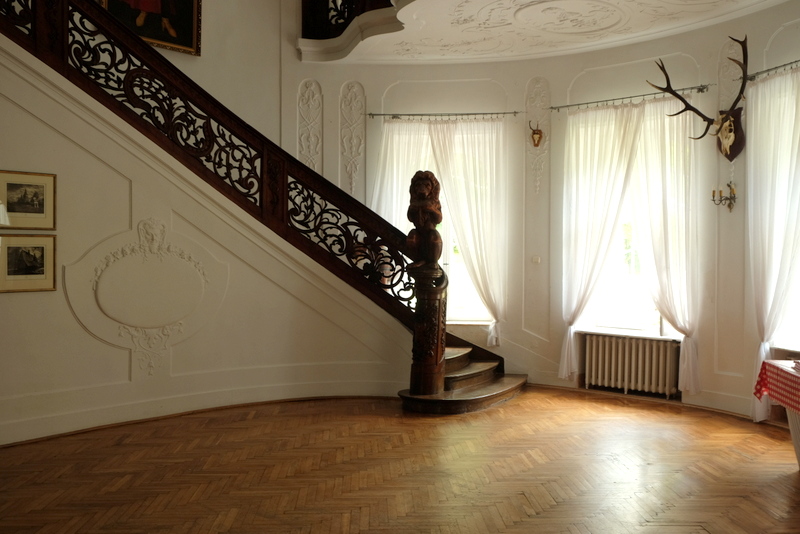 Ponadto sala balowa, sypialnie, piękne meble, piece kaflowe i kominki, wewnętrzne schody z drewnianymi, bogato rzeźbionymi balustradami, żyrandole itp.