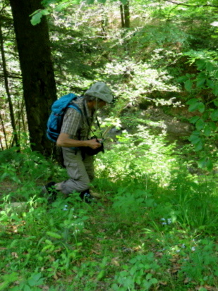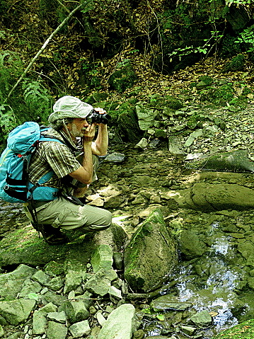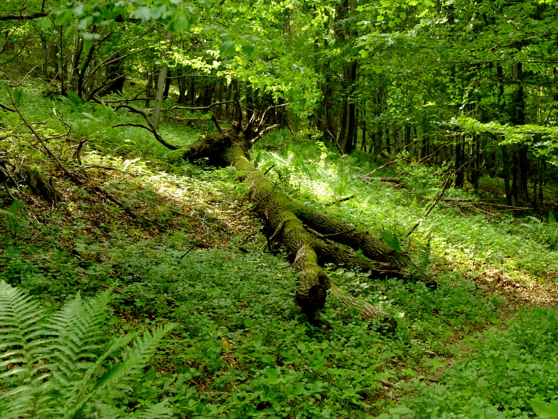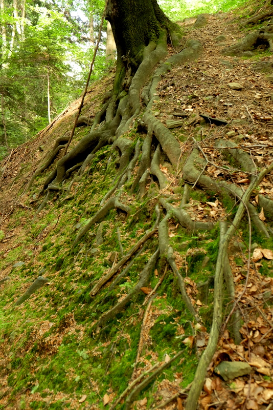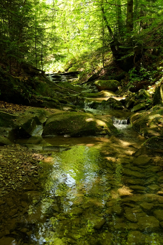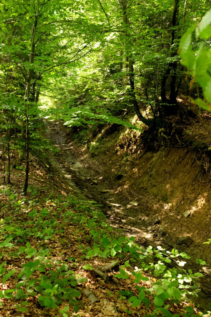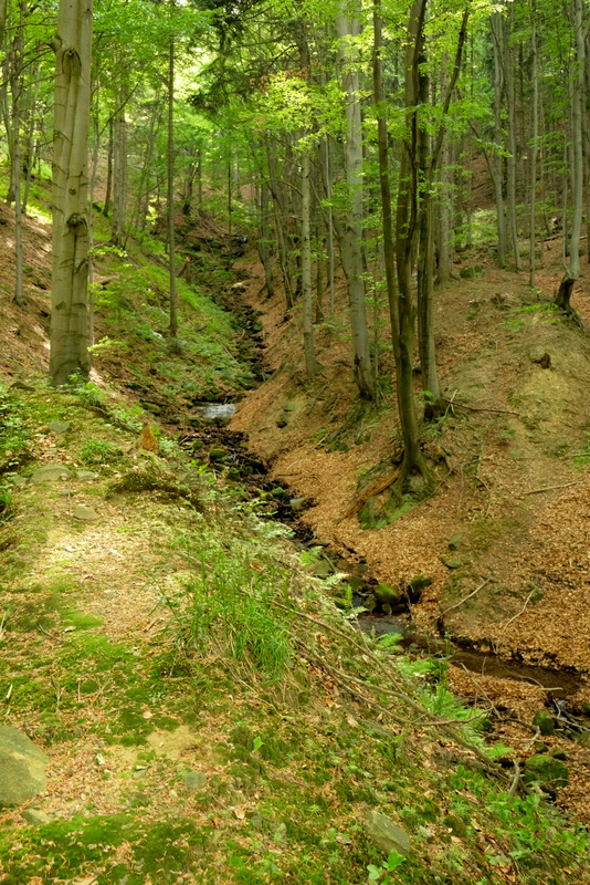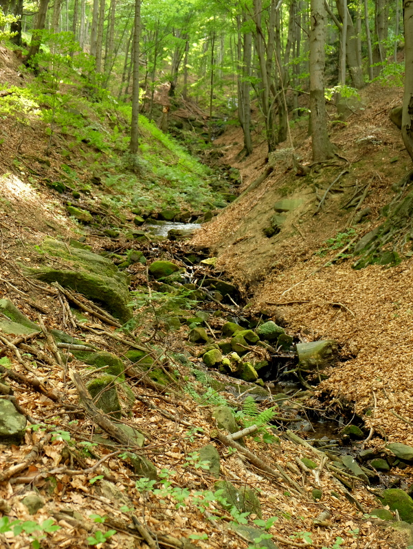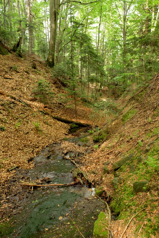 Z Czereśli zaczynamy schodzić na północ słabo widoczną w terenie ścieżką. Dochodzimy w ten sposób do szemrzącego strumyka spływającego stromym i coraz głębszym jarem.