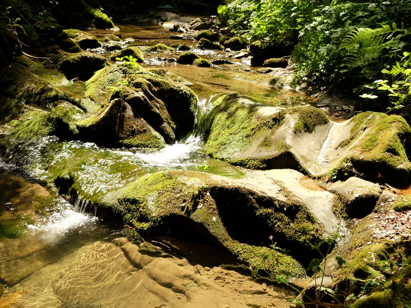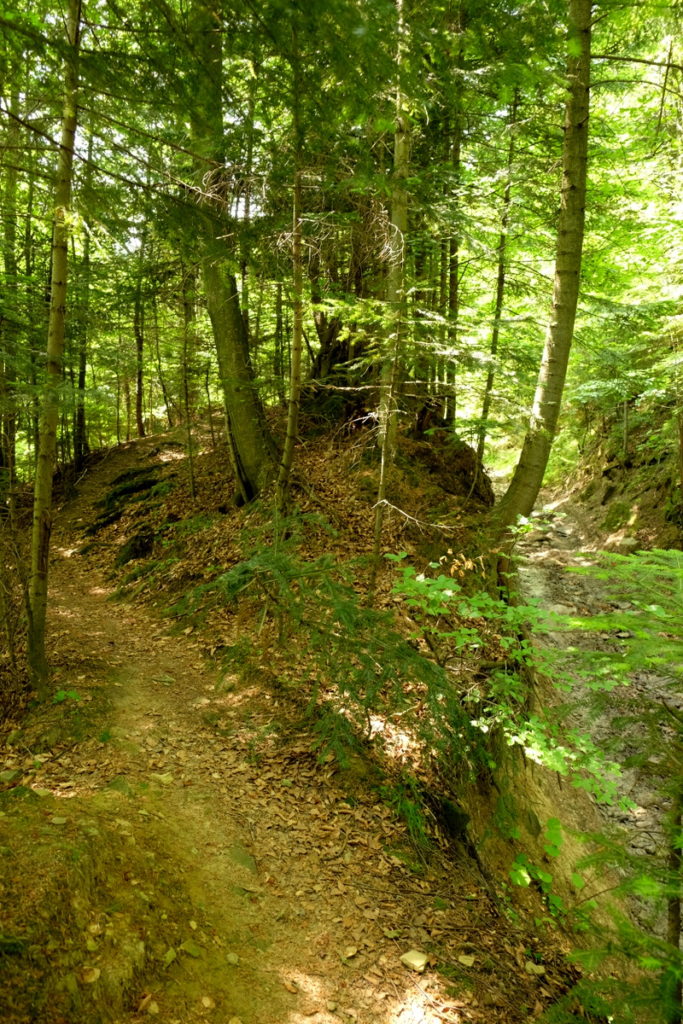 Nieco wyżej potok staje się węższy a kaskady niższe. Jar potoku też staje się głębszy – to znaki, że trzeba opuścić koryto i przenieść się na szlak. Wychodzimy na niego nieopodal odgałęzienia się szlaku zielonego w kierunku Folusza.