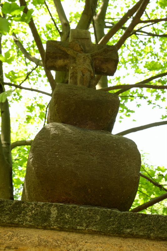 Kamienny dach kapliczki zwieńczony jest ciekawym kamiennym krzyżem. Stoi on na dwóch baniastych, kamiennych kulach.