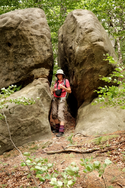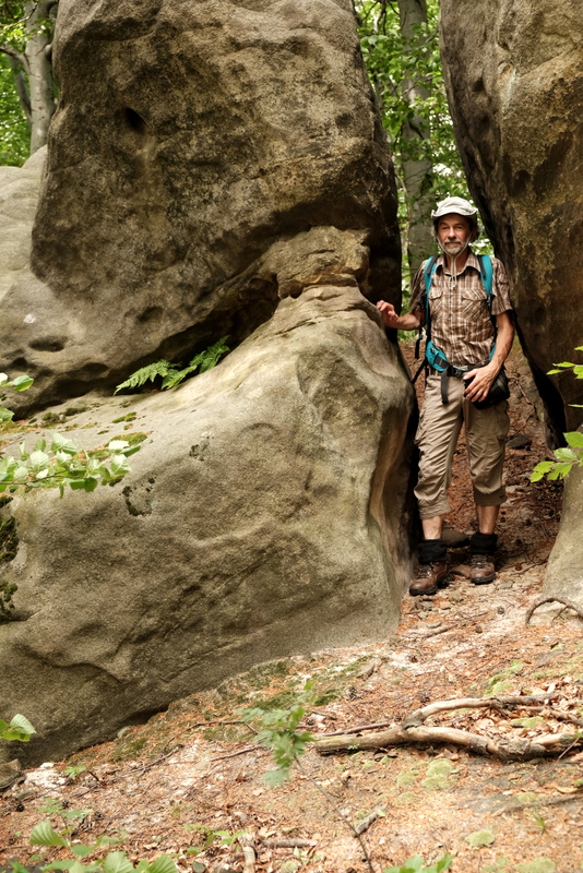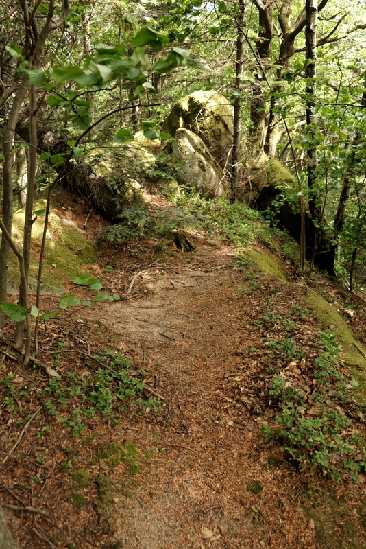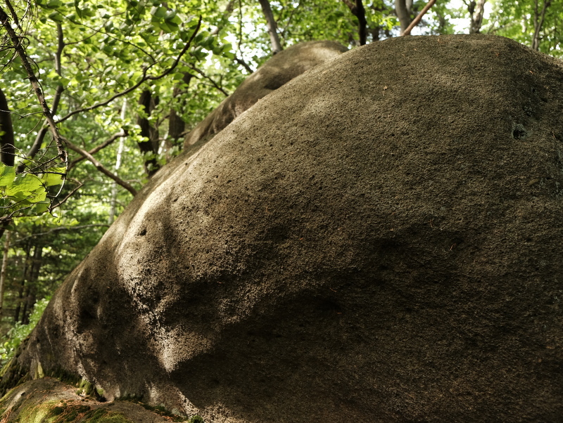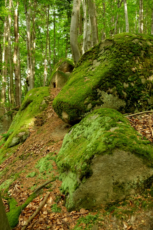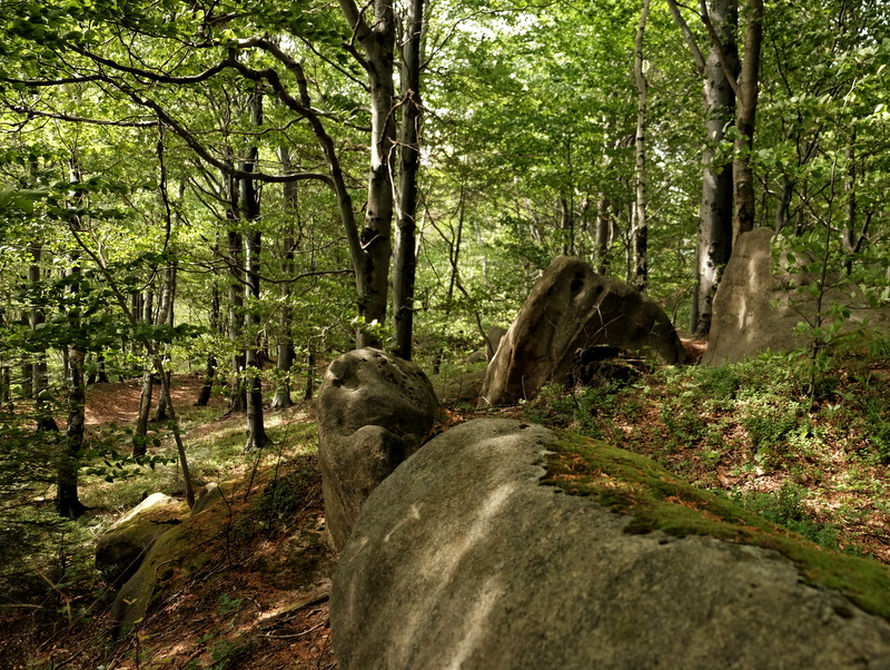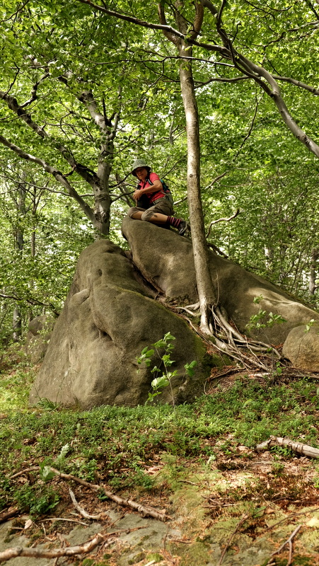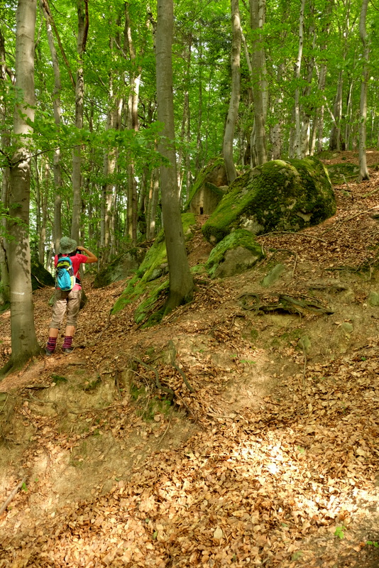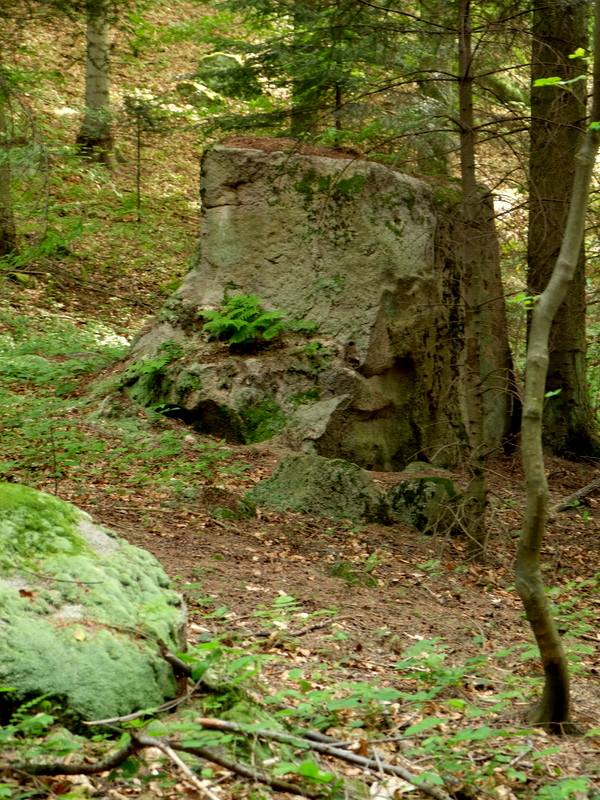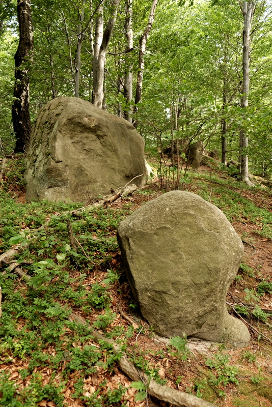 Na przełęczy opuszczamy szlak zielony i kierujemy się leśną ścieżką w kierunku południowo-zachodniej kulminacji Zamkowej Góry. W tym rejonie zaczyna się kolejna atrakcja dzisiejszej wędrówki. Im wyżej podchodzimy tym więcej pojawia się wystających z gruntu kamiennych ostańców.