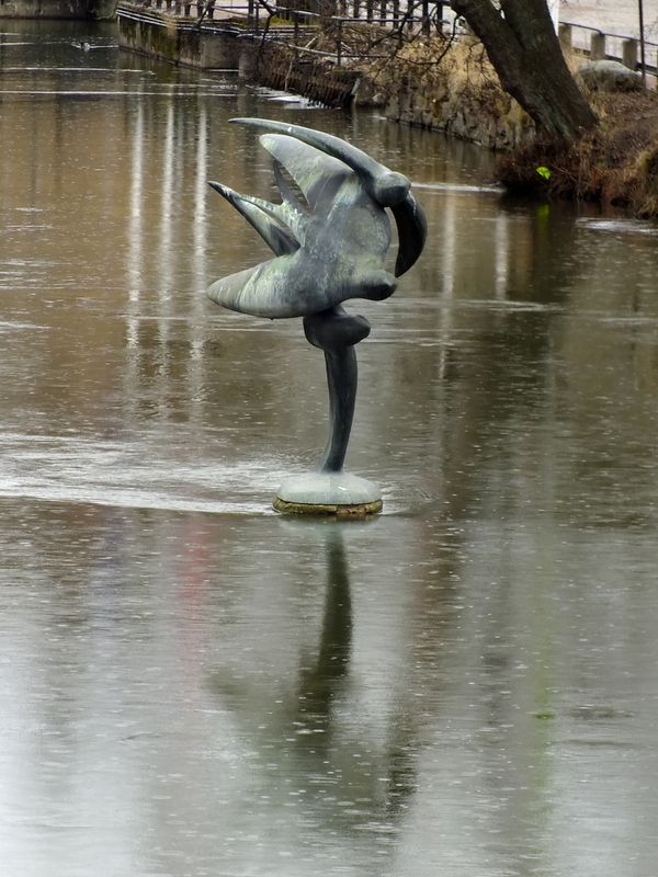 Na środku rzeki wystaje z wody figura przedstawiająca trzy jaskółki w locie nad wodą.
