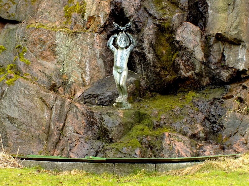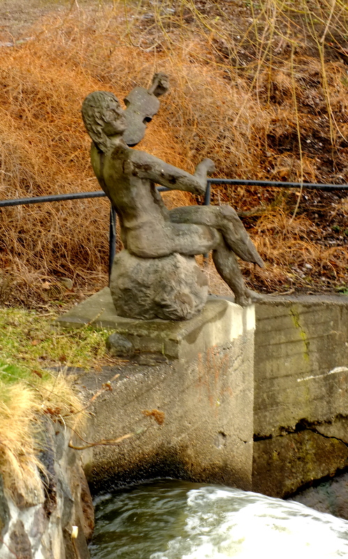 Na brzegu rzeki, tuż poniżej wodospadu pod płaczącą wierzbą znajduje się uroczy posążek siedzącego i grającego na skrzypcach muzyka.