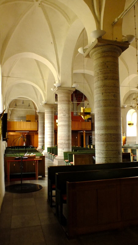 Niestety, nie można było wejść do środka bo był zamknięty. Szkoda bo znajduje się tam piękny ołtarz autorstwa artysty Georga Engelharda Schrödera ufundowany przez królową Ulrikę Eleonorę. Jest tam też późnogotycka szafka ołtarzowa, która pochodzi z około 1500 roku oraz pięknie zdobiona, barokowa ambona wyrzeźbiona w 1748 r. przez Niklasa Österboma z Norrköping. Od 1925 roku stoi tu chrzcielnica z XIII wieku wykonana na wyspie Gotlandii, którą znaleziono w jednym z ogrodów w miejscowości Stigtoma. Bardzo ważna rolę w kościołach protestanckich odgrywają organy więc i w tym kościele mają one bogatą historię. Były one wielokrotnie zmieniane a ostatnie z nich mają wspaniałe brzmienie i są też wyjątkowo piękne.