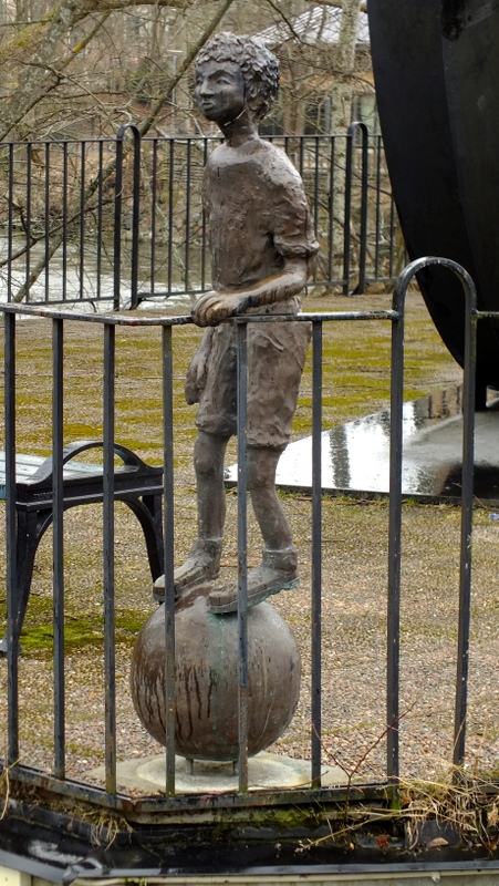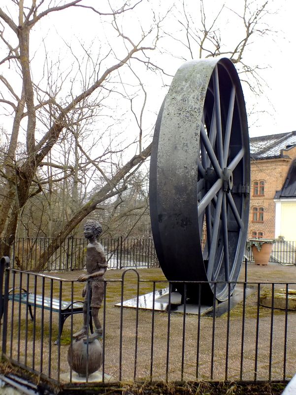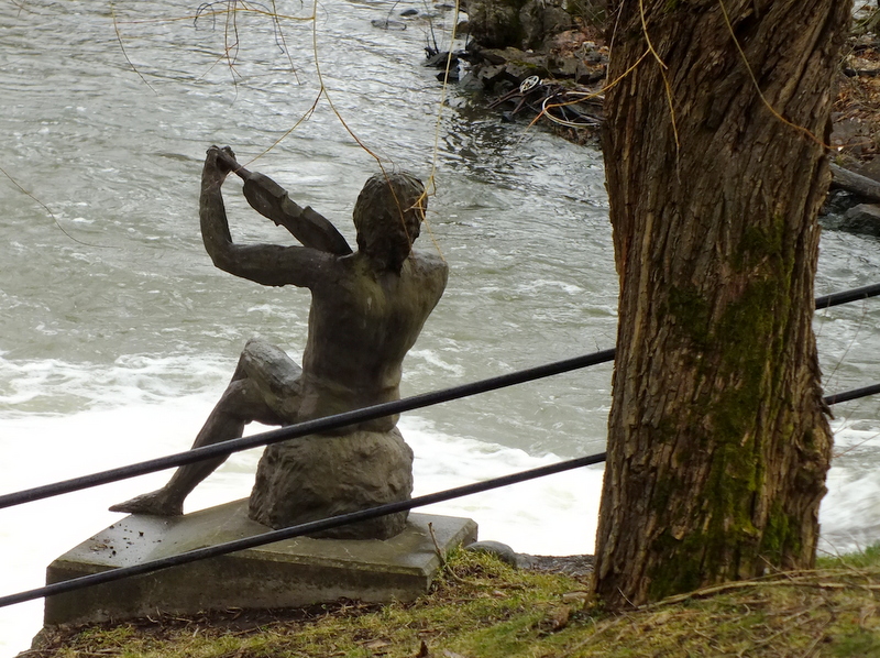 Idąc brzegiem rzeki można obserwować wodospad i różne rzeźby i pomniki. Przy moście stoi pomnik dwóch prawie 4 metrowych żelaznych kół a obok figura chłopca stojącego na kuli.