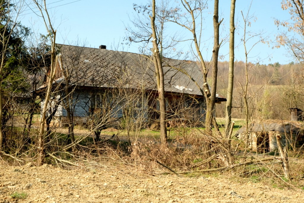 Docieram do miejsca, w którym pod wysokimi modrzewiami stoi budynek dawnej szkoły. W czasie wakacji wykorzystywany był on jako Schronisko Młodzieżowe o czym świadczy trójkątny, zielony znak na ścianie budynku. Niestety nie mam informacji czy to schronisko jeszcze działa. Szkoła przestała istnieć wraz z końcem roku szkolnego 25 czerwca 1996 r. Dziś budynek wygląda dość solidnie i ktoś o niego dba. Budynek ten i otaczający go trawnik otoczony jest drewnianym płotem. Za płotem, obok bramki wejściowej przy tujach stoi piękny ale zaniedbany, żeliwny krzyż na kamiennym cokole. Dalej, przy narożniku płotu, stoi zarośnięty krzakami inny, w całości z kamienia, z uszkodzoną figurka Chrystusa krzyż – z datą 1904.