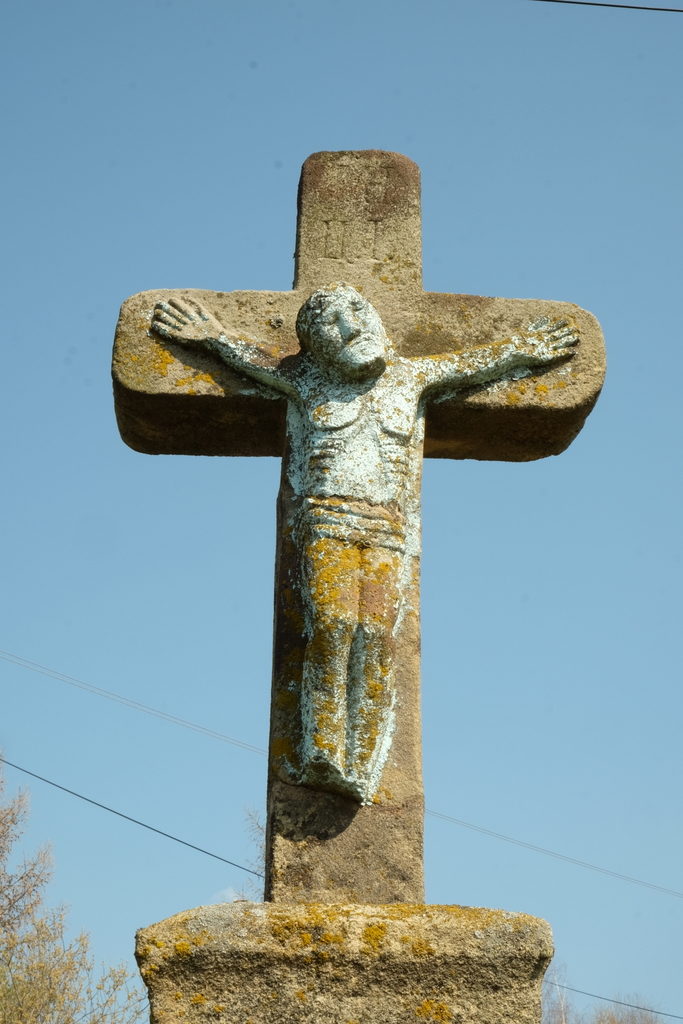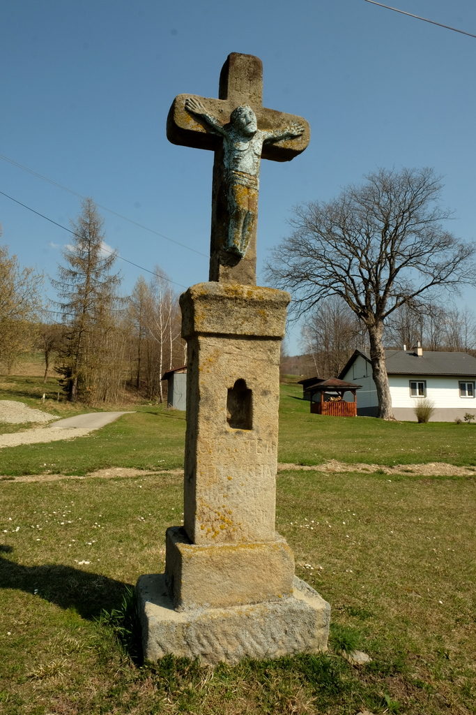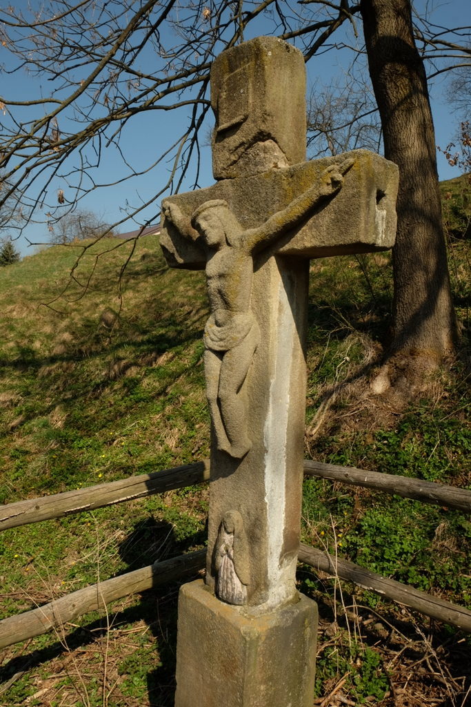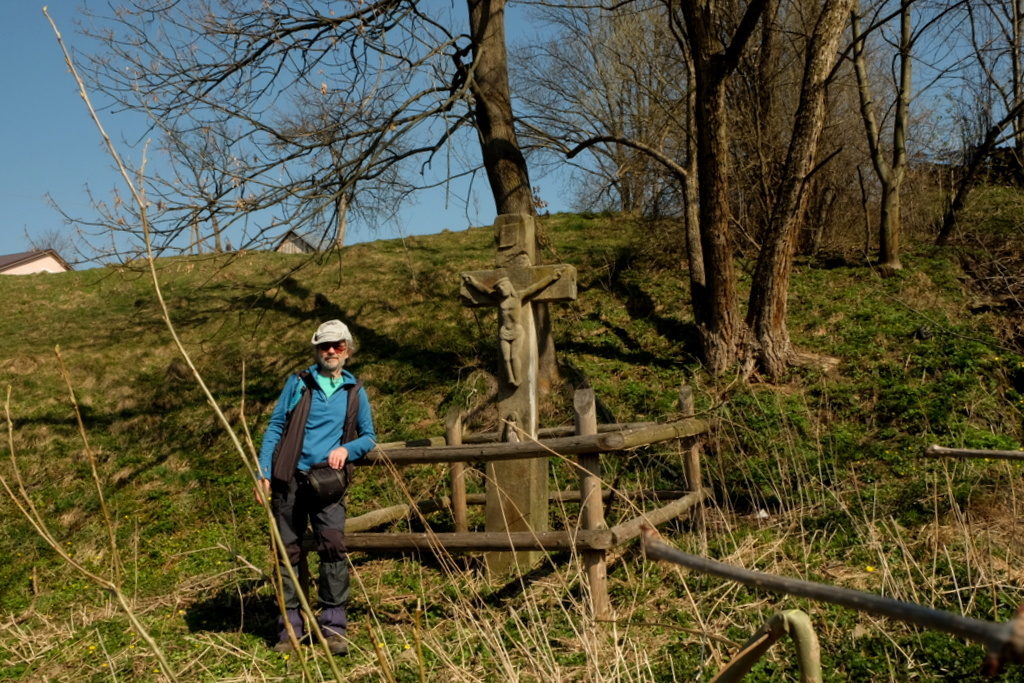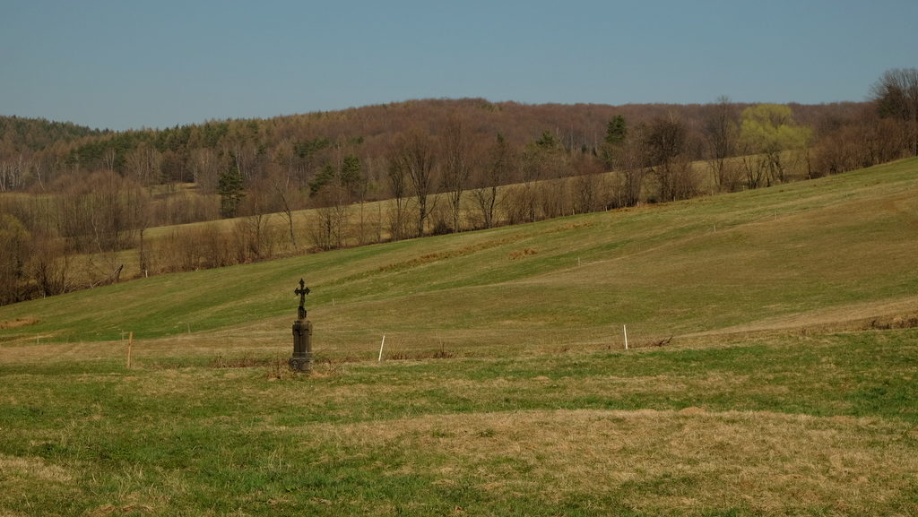 Za cmentarzami jest już niewiele domów i to już praktycznie koniec wsi. Mijam kolejny przydrożny, kamienny krzyż. Widać ślady klejenia bo kiedyś był utrącony. Idę szutrową drogą i za ostatnim domem wychodzę na otwartą przestrzeń. Wzdłuż potoków rosną oczywiście drzewa i zarośla łęgowe. W pewnym momencie za potokiem dostrzegam samotny krzyż. Kieruję się w jego stronę ale muszę pokonać w bród potok. Poziom wody jest niski więc nie mam z tym większego problemu.