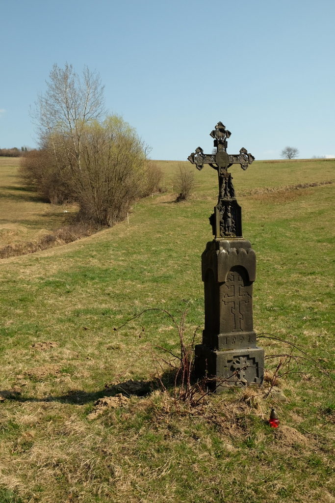 Powoli idąc dalej niepostrzeżenie wchodzę na teren dzisiejszych Owczar Górnych, które przez zamieszkujących je Łemków nazywane były Rieczkami. Po lewej stronie trudny do zauważenia kamienny krzyż, który stojąc z dala od drogi często zasłoniety jest przez trawy i wysokie chwasty. O tej porze roku jest dobrze widoczny bo chwasty jeszcze nie wyrosły.