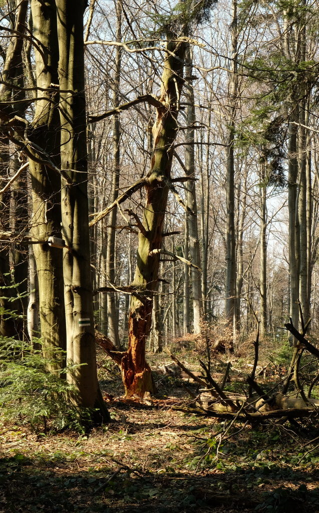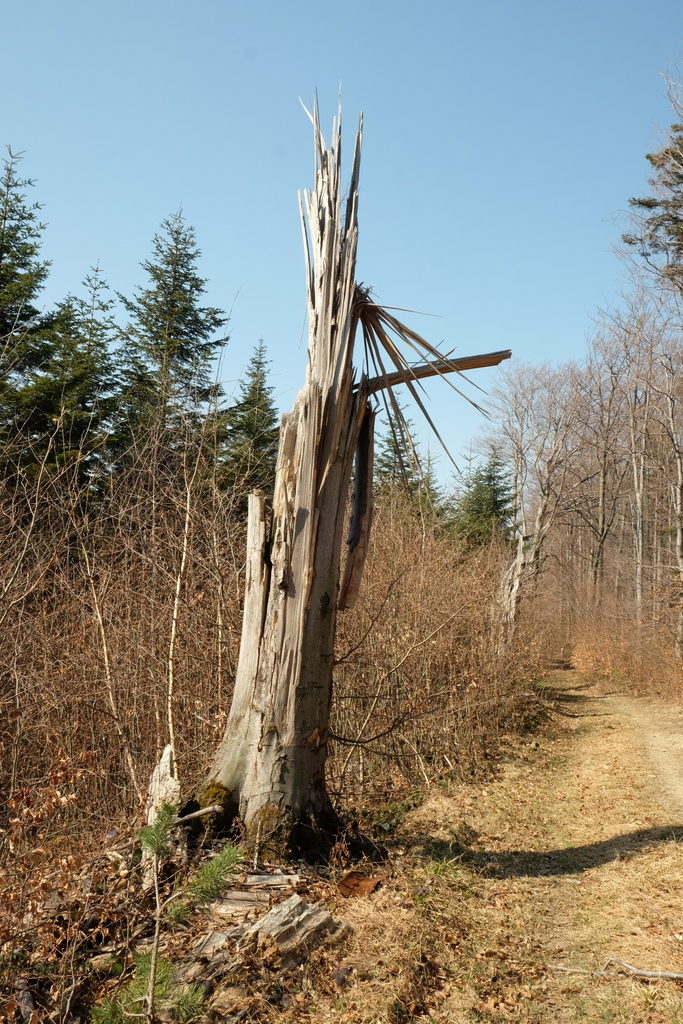 Moja dalsza wędrówka przebiegać będzie grzbietem wału Magury Małastowskiej zgodnie ze znakami zielonego szlaku turystycznego PTTK. Szlak jest tu bardzo łagodny i nudny, gdyż cały grzbiet porasta las i nie ma co liczyć na jakiekolwiek miejsca widokowe. Jedynym urozmaiceniem są powalone drzewa, które tarasują przejście i trzeba je pokonywać lub obchodzić. Czasem sterczące jeszcze pnie połamanych kilka lub kilkanaście lat temu drzew przybierają dziwne formy. Ludzie z bujniejszą wyobraźnią dopatrzą się w nich ciekawych postaci.