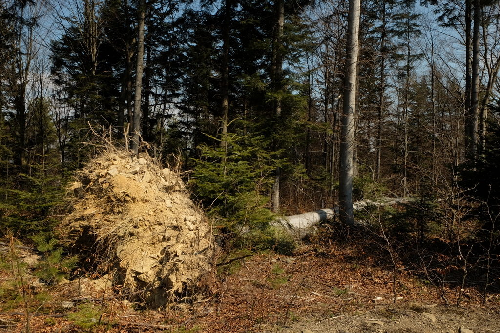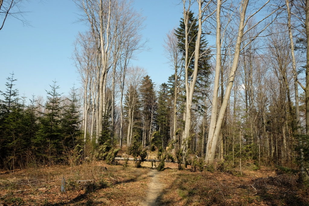 Obecnie już tną i wywożą tirami mnóstwo bukowego i jodłowego drewna! Cóż idę dalej i rozmyślam nad tą rabunkowa gospodarką leśną … Mijam pierwszą i podchodzę pod drugą kulminację Sołtysiej Góry.