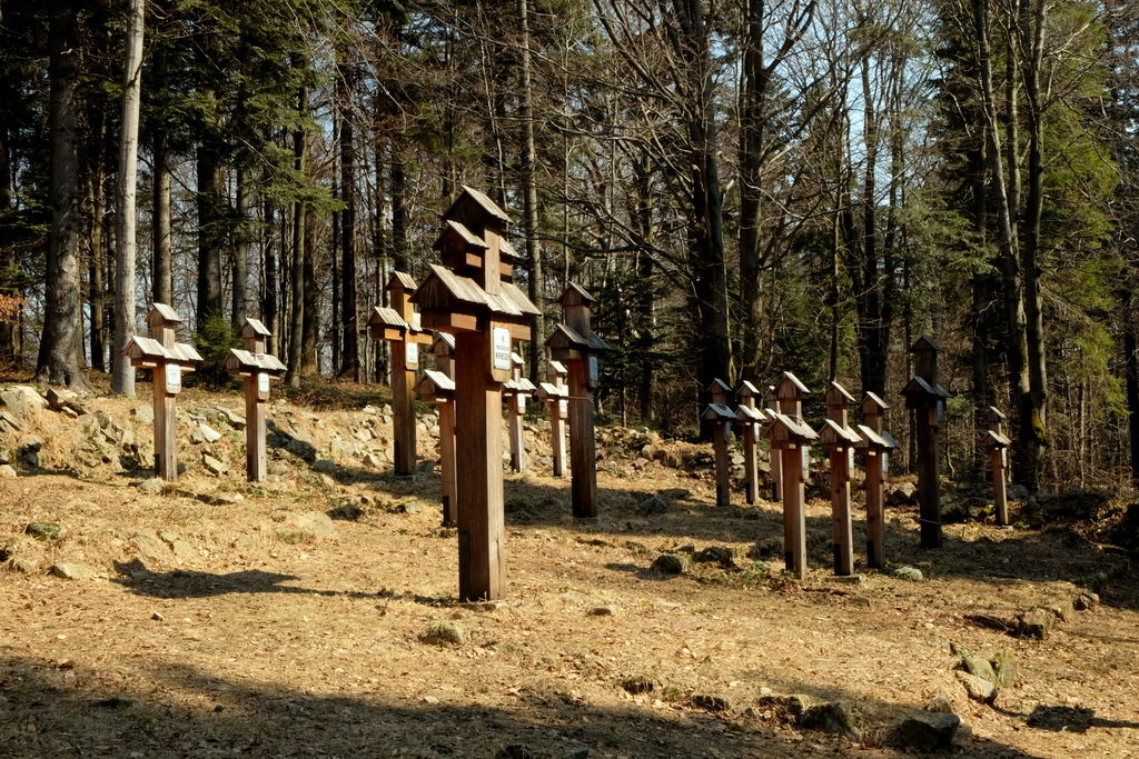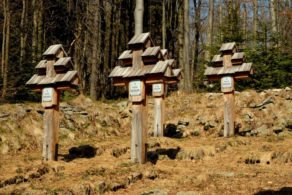 Po lewej – stary cmentarz łemkowski a za nim cmentarz z Wielkiej Wojny nr 70 – Rychwałd. Cmentarz wojenny należy do III Okręgu Cmentarnego – Gorlice. Projektował go Hans Mayr.